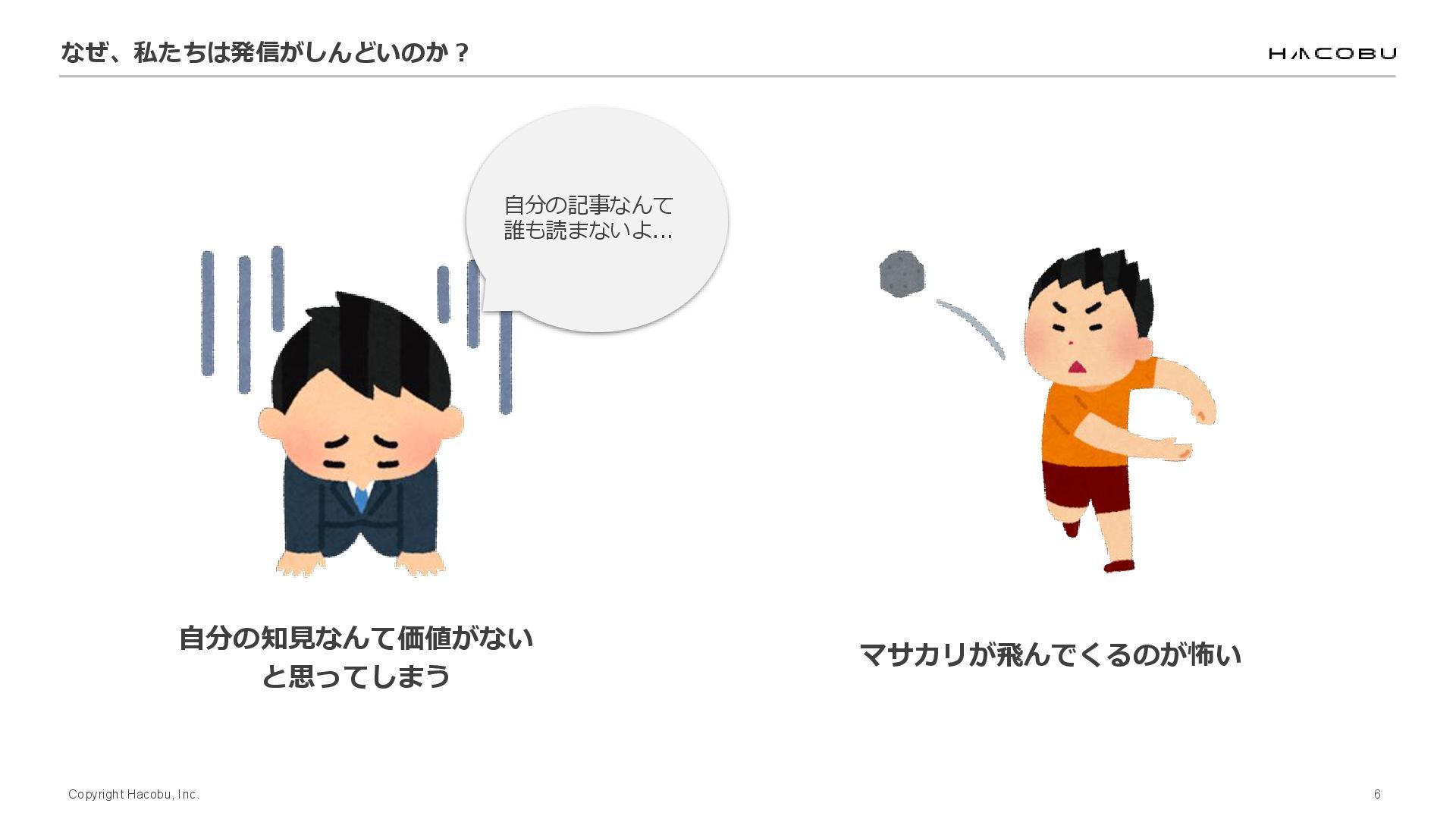 Copyright Hacobu, Inc. 7 なぜ、私たちは発信がしんどいのか? 自分の知見なんて価値がない と思ってしまう マサカリが飛んでくるのが怖い 自分の記事なんて 誰も読まないよ...