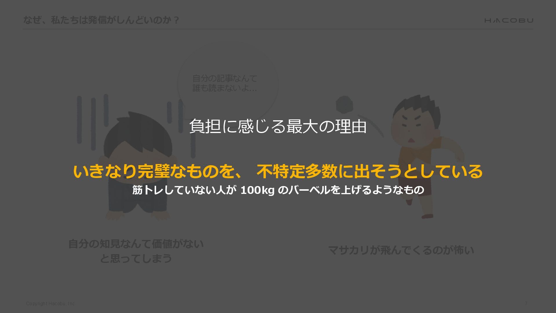 Copyright Hacobu, Inc. 6 なぜ、私たちは発信がしんどいのか? 自分の知見なんて価値がない と思ってしまう マサカリが飛んでくるのが怖い 自分の記事なんて 誰も読まないよ...