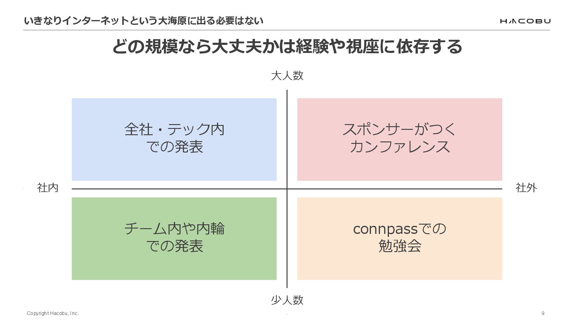 カンファレンス connpassでの 勉強会 全社・テック内 での発表 チーム内や内輪 での発表 どの規模なら大丈夫かは経験や視座に依存する