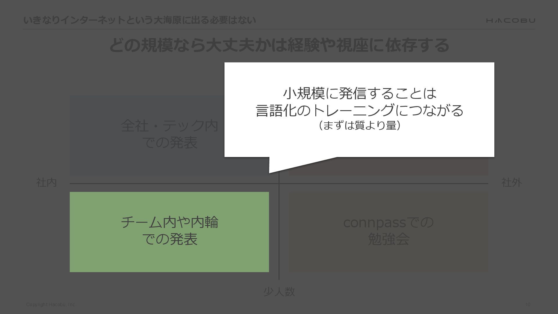 Copyright Hacobu, Inc. 9 いきなりインターネットという大海原に出る必要はない 社外 社内 少人数 大人数 スポンサーがつく