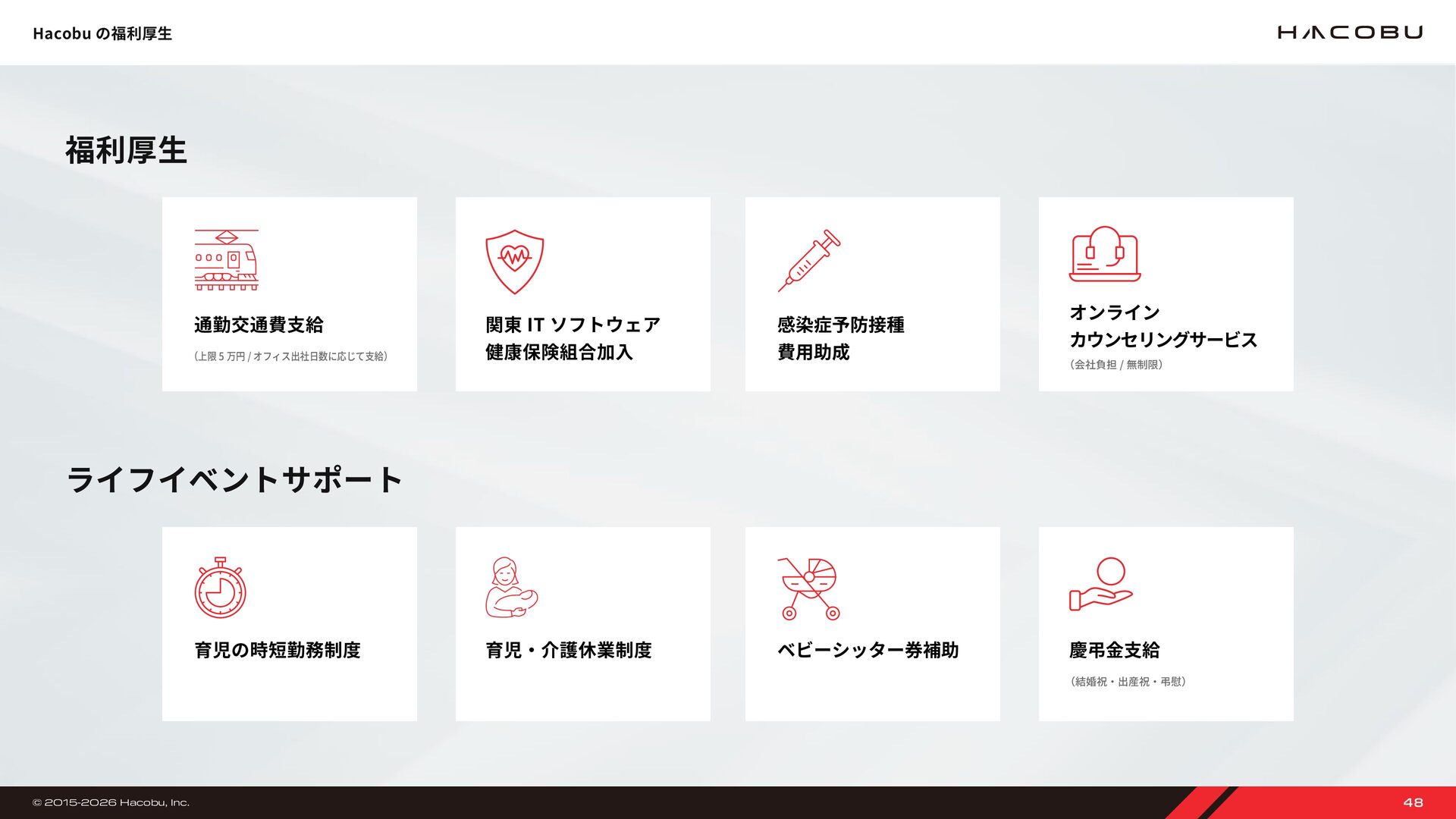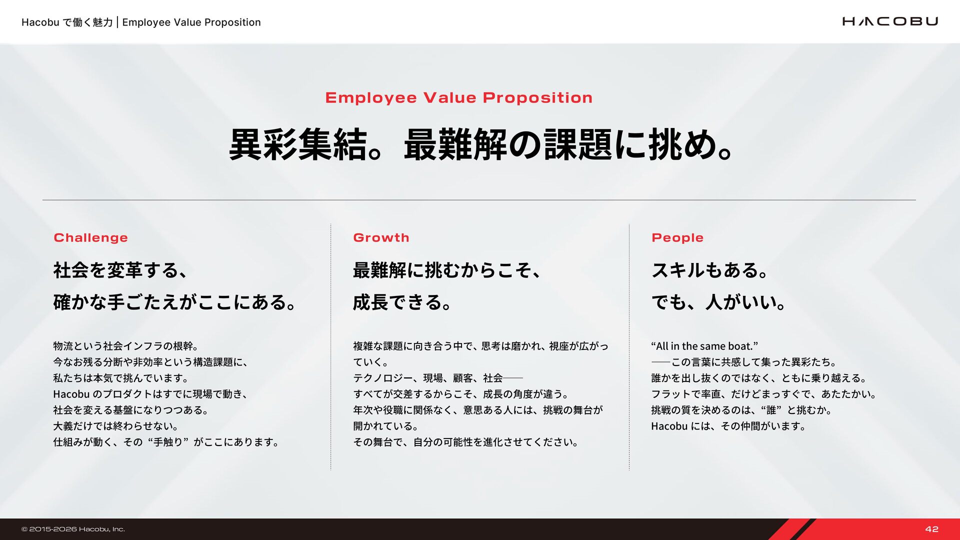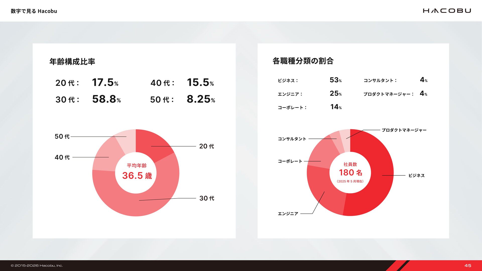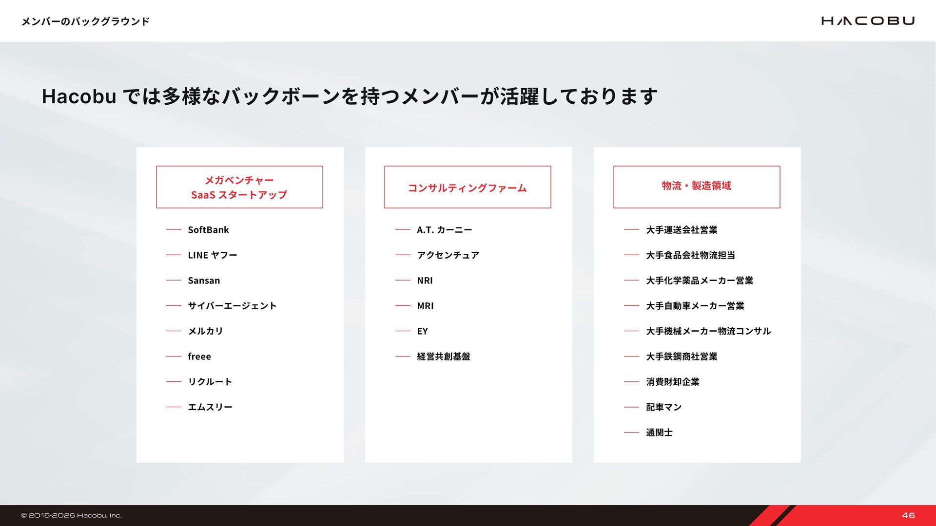 9,000 万円 18 億 6,000 万円 14 億 9,000 万円 28 億 3,000 万円 株式会社 Hacobu を設立 ベンチャー・ユナイテッド株式会社、YJ キャピタル株式会社、株式会社オージス総研を引受先とした資金調達を実施 資金調達額推移 2016 年 2017 年 アスクル株式会社、Visionnaire Ventures、アーキタイプベンチャーズ株式会社、SMBC ベンチャーキャピタル株 式会社を引受先とした資金調達を実施 2019 年 動態管理サービス「MOVO Fleet」の提供を開始 大和ハウス工業株式会社と業務提携契約を締結 大和ハウス工業株式会社、Sony Innovation Fund を引受先とした資金調達を実施 2018 年 2020 年 トラック予約受付サービス「MOVO Berth」の提供を開始 三井不動産株式会社、日野自動車株式会社を引受先とした資金調達を実施 2023 年 流通資材モニタリングサービス MOVO Seek の提供を開始に向けた実証実験 荷物管理サービス MOVO Vista の提供を開始 JIC ベンチャー・グロース・インベストメンツ株式会社、野村不動産グループ、豊田通商株式会社、Logistics Innovation Fund らを引受先とした資金調達を実施 配車管理サービス MOVO Dispatch の提供を開始 本社を三田の新オフィスへ移転。高い心理的安全性を実現するため、ハード・ソフト両面からワークプレイスを最適化 物流 DX 人材育成プログラム MOVO ACADEMY の開講を発表 三菱倉庫株式会社、IDATEN Ventures らを引受先とした資金調達を実施 トラックドライバー向け業務効率化アプリ MOVO Driver(β版)を提供開始 商工組合中央金庫より、3 億円の無保証資金調達を実施。資金調達総額は約 46 億円に 2022 年 2021 年 2024 年 「物流ビッグデータラボ」創設 共同輸配送支援サービス「MOVO X-Data」提供開始 生産・販売・在庫管理サービス「MOVO PSI」提供開始 トラック予約受付サービス「MOVO Berth」が 5 年連続シェア No.� を獲得 累計登録ドライバー数は 70 万人を突破 2025 年 日経ビジネス主催「CLO オブザイヤー 2025」に協力 リアルイベント「Hacobu Innovation Day ����」開催。物流リーダー 300 名が集結 利用事業所数 3 万突破 Hacobu、東京オフィスを移転 マーキュリア・サプライチェーン投資事業有限責任組合、鴻池運輸株式会社らから合計 7 億円の資金調達を実施 物流 DX システムインテグレーション「Hacobu Solution Studio」提供開始 2017 年 7 月 2017 年 2019 年 2020 年 2021 年 2023 年 2024 年 2025 年 46 億 49 億 56 億 © 2015-2026 Hacobu, Inc. 34