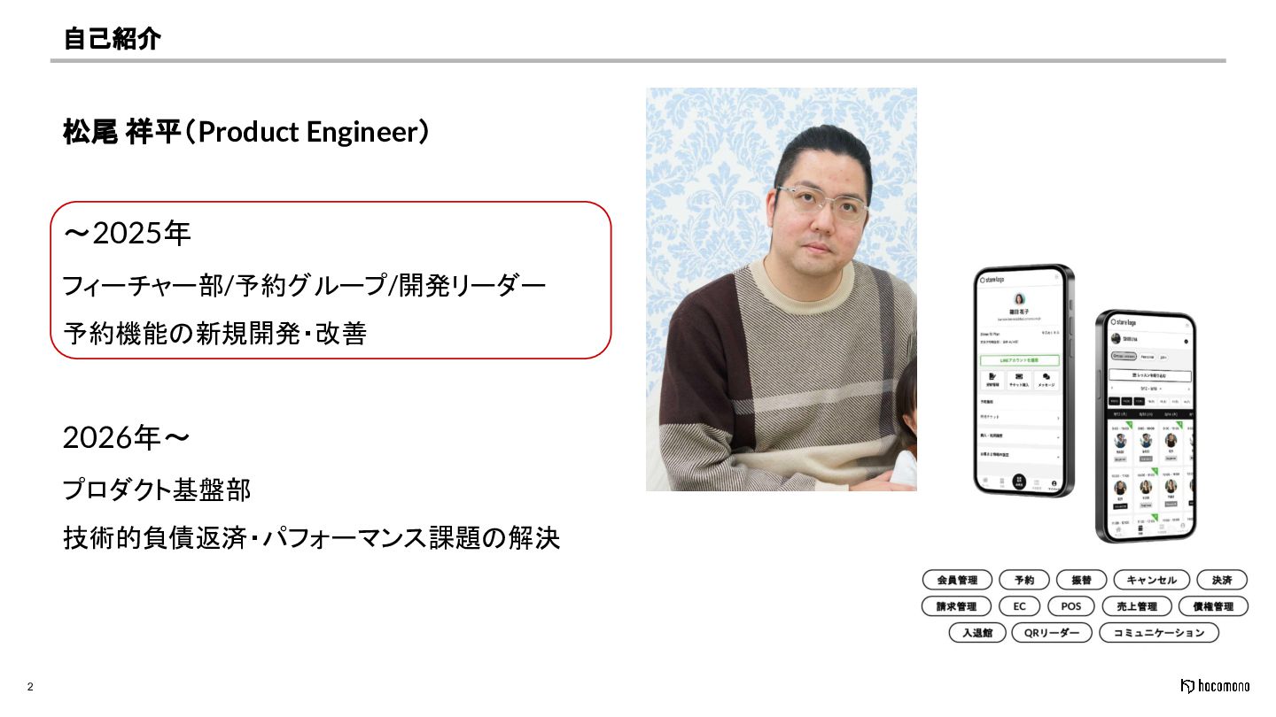 2 自己紹介 松尾 祥平(Product Engineer) 〜2025年 フィーチャー部/予約グループ/開発リーダー 予約機能の新規開発・改善 2026年〜 プロダクト基盤部
