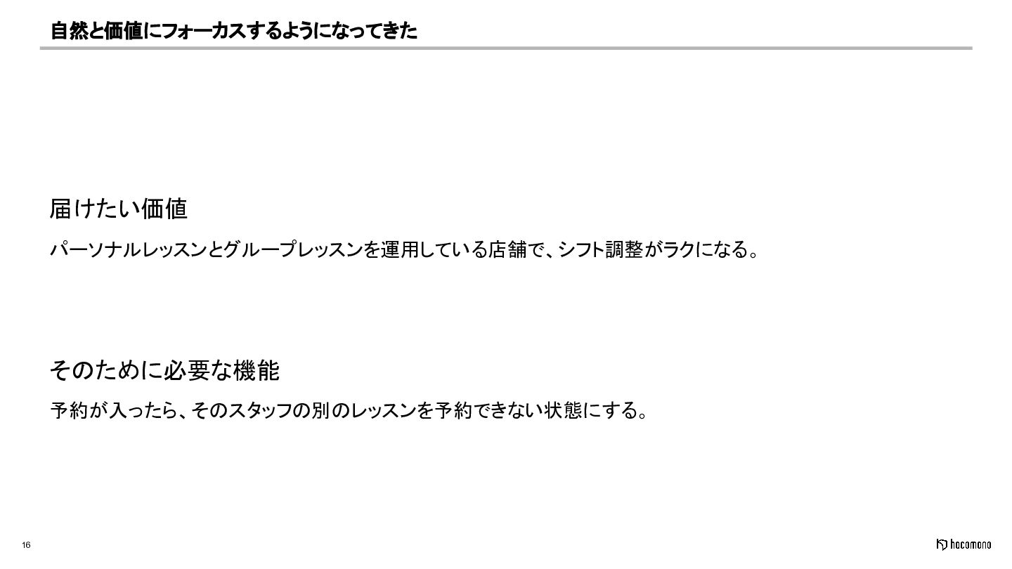 16 自然と価値にフォーカスするようになってきた 届けたい価値 パーソナルレッスンとグループレッスンを運用している店舗で、シフト調整がラクになる。 そのために必要な機能 予約が入ったら、そのスタッフの別のレッスンを予約できない状態にする。