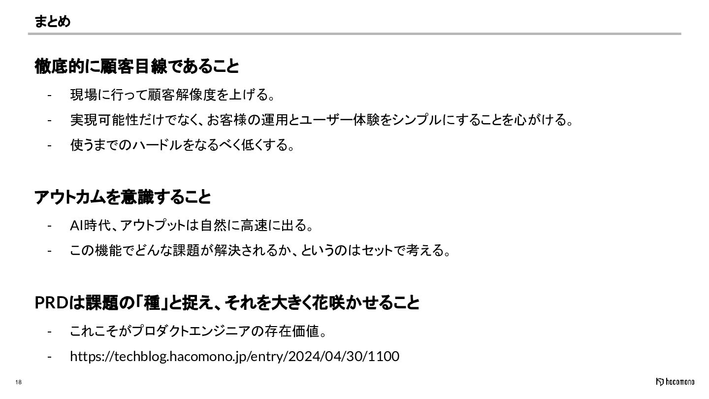 - AI時代、アウトプットは自然に高速に出る。 - この機能でどんな課題が解決されるか、というのはセットで考える。 PRDは課題の「種」と捉え、それを大きく花咲かせること - これこそがプロダクトエンジニアの存在価値。 - https://techblog.hacomono.jp/entry/2024/04/30/1100