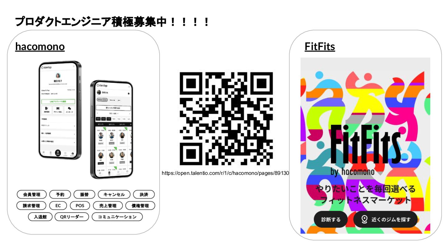 プロダクトエンジニア積極募集中!!!! hacomono FitFits https://open.talentio.com/r/1/c/hacomono/pages/89130