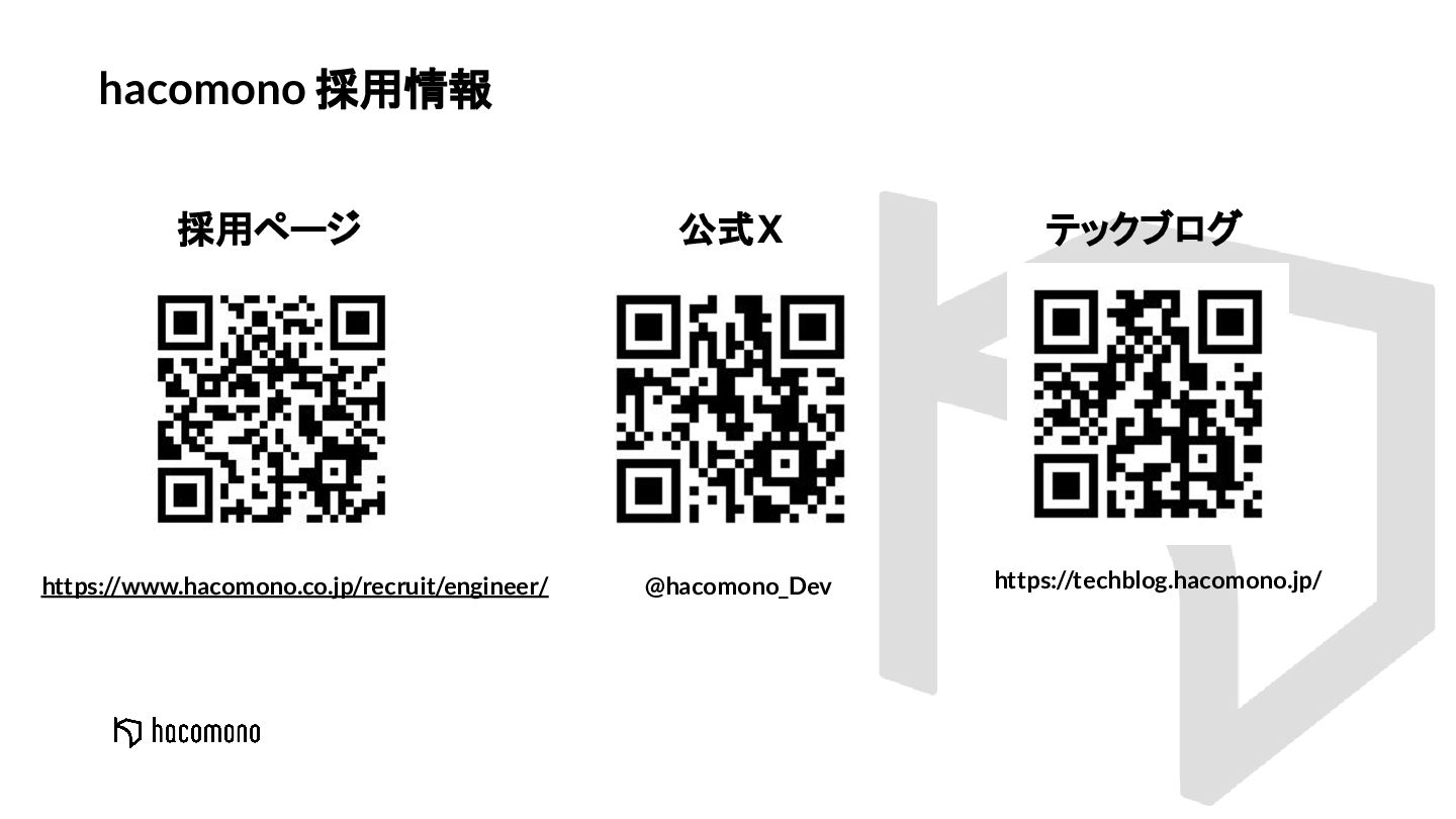 Last Update 2022.03.16 hacomono 採用情報 https://www.hacomono.co.jp/recruit/engineer/ 採用ページ @hacomono_Dev 公式X テックブログ