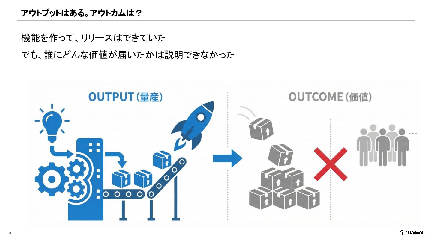 5 アウトプットはある。アウトカムは? 機能を作って、リリースはできていた でも、誰にどんな価値が届いたかは説明できなかった