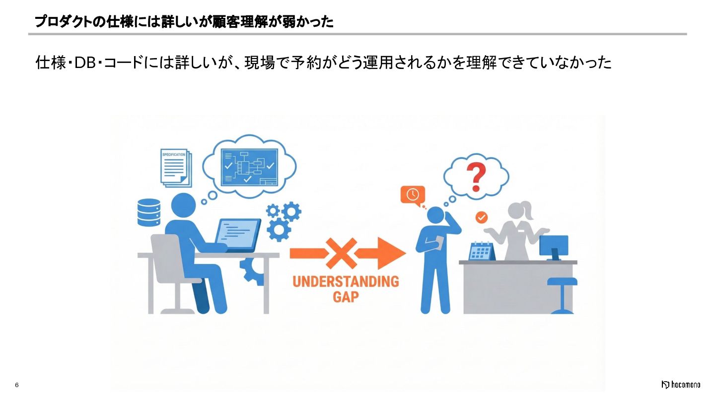 6 プロダクトの仕様には詳しいが顧客理解が弱かった 仕様・DB・コードには詳しいが、現場で予約がどう運用されるかを理解できていなかった