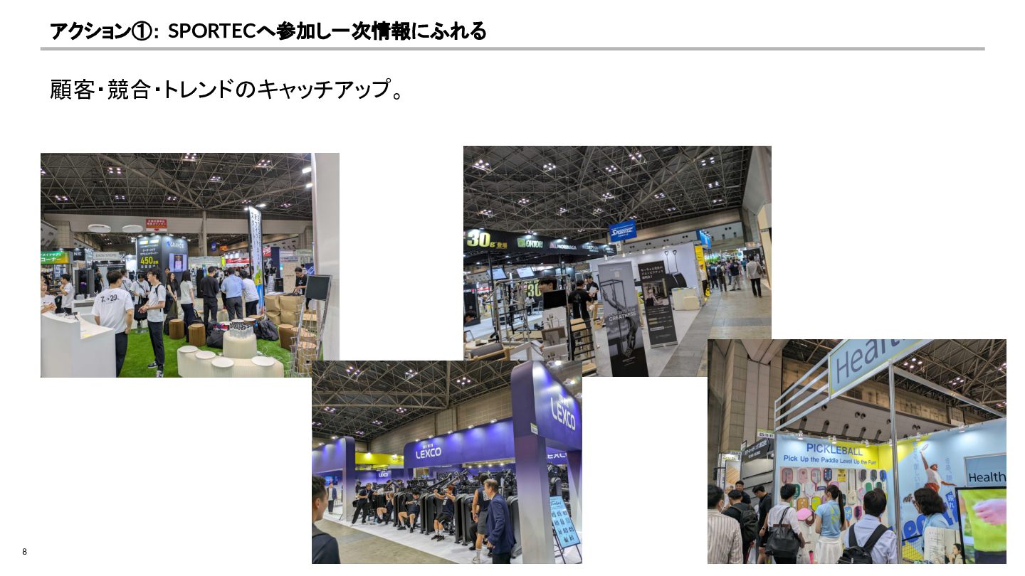 8 アクション①: SPORTECへ参加し一次情報にふれる 顧客・競合・トレンドのキャッチアップ。