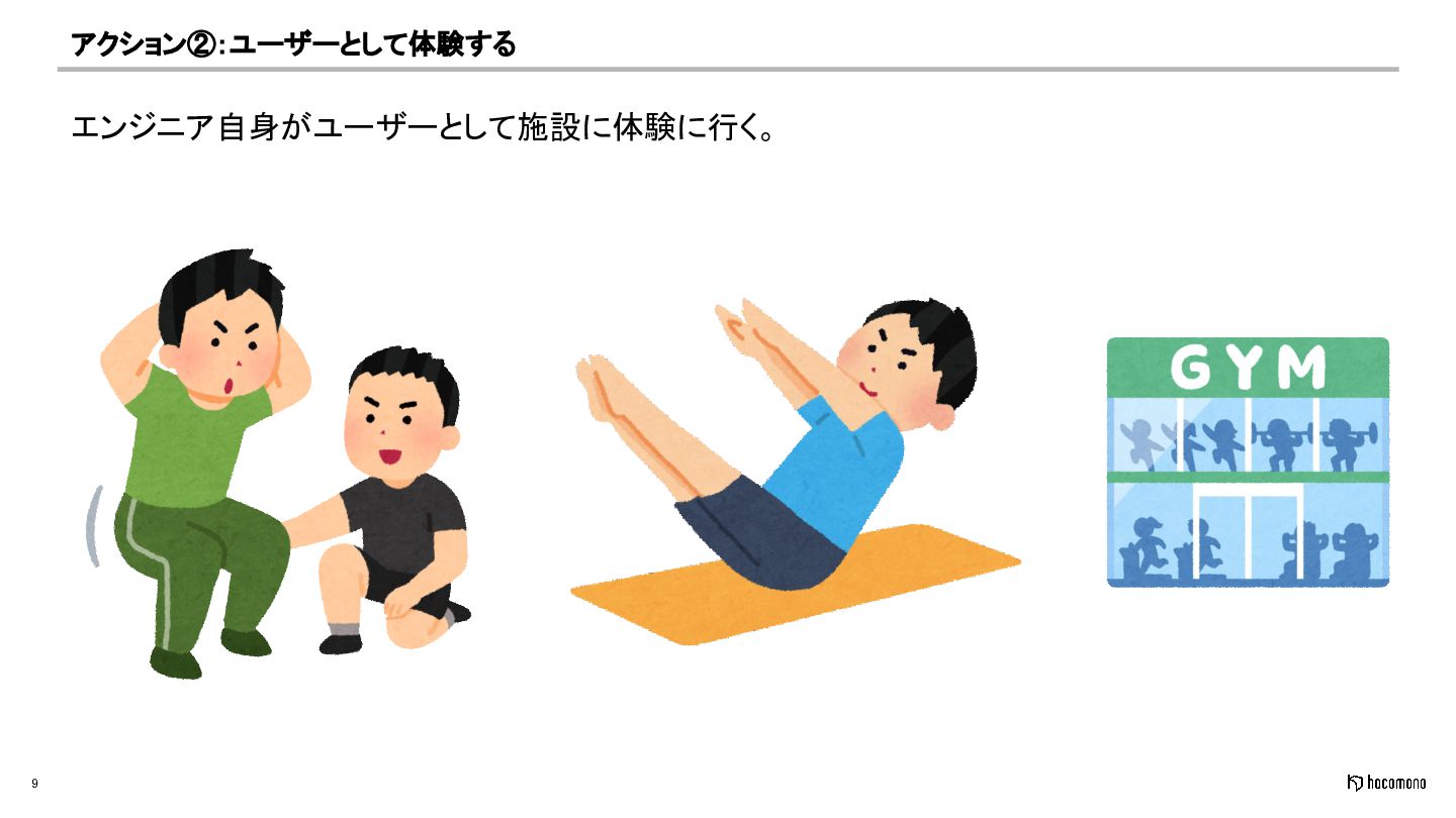 9 アクション②:ユーザーとして体験する エンジニア自身がユーザーとして施設に体験に行く。