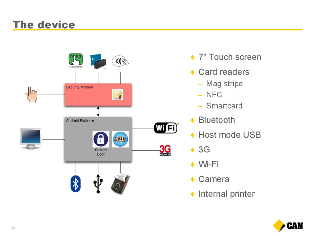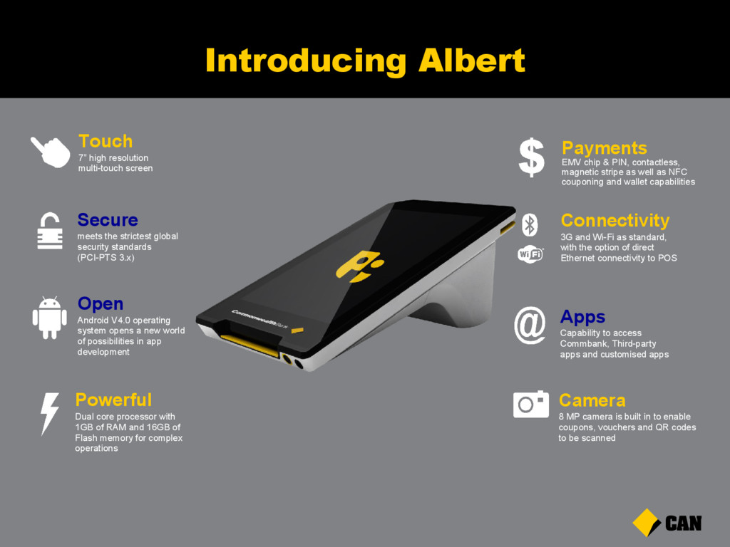 3.x) Open Android V4.0 operating system opens a new world of possibilities in app development Touch 7” high resolution multi-touch screen Powerful Dual core processor with 1GB of RAM and 16GB of Flash memory for complex operations Apps Capability to access Commbank, Third-party apps and customised apps Connectivity 3G and Wi-Fi as standard, with the option of direct Ethernet connectivity to POS Camera 8 MP camera is built in to enable coupons, vouchers and QR codes to be scanned Payments EMV chip & PIN, contactless, magnetic stripe as well as NFC couponing and wallet capabilities
