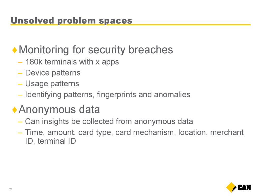 terminals with x apps – Device patterns – Usage patterns – Identifying patterns, fingerprints and anomalies ♦Anonymous data – Can insights be collected from anonymous data – Time, amount, card type, card mechanism, location, merchant ID, terminal ID