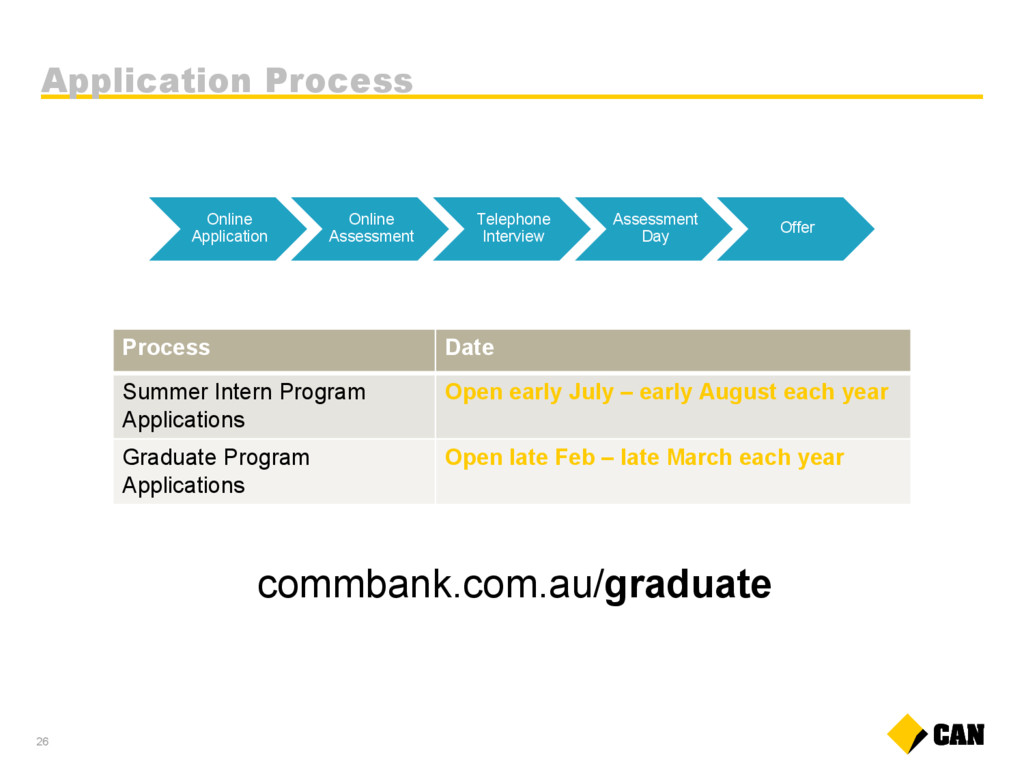 Day Offer Process Date Summer Intern Program Applications Open early July – early August each year Graduate Program Applications Open late Feb – late March each year commbank.com.au/graduate