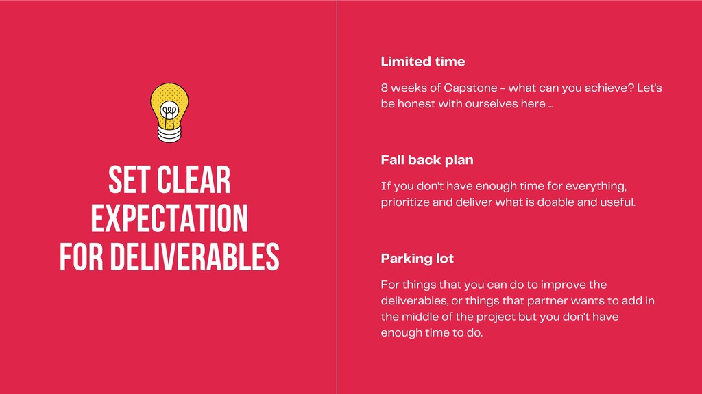 achieve? Let's be honest with ourselves here ... Fall back plan If you don't have enough time for everything, prioritize and deliver what is doable and useful. Parking lot For things that you can do to improve the deliverables, or things that partner wants to add in the middle of the project but you don't have enough time to do. Set Clear expectation for deliverables