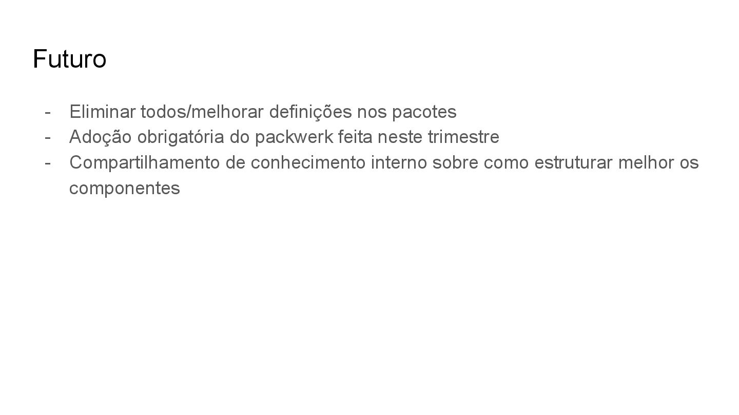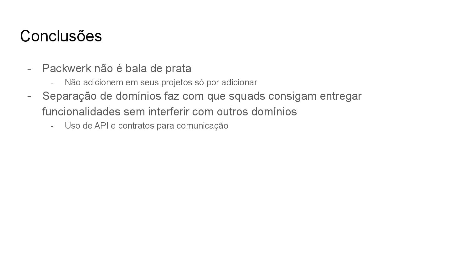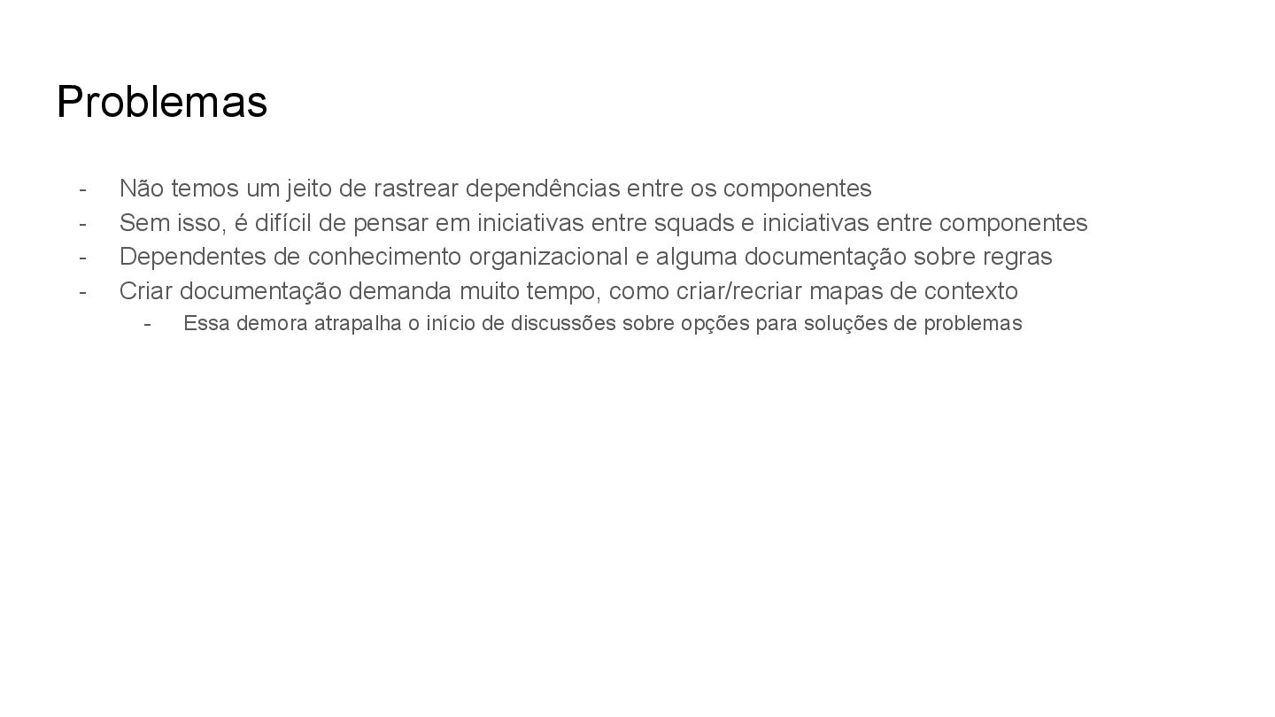 os componentes - Sem isso, é difícil de pensar em iniciativas entre squads e iniciativas entre componentes - Dependentes de conhecimento organizacional e alguma documentação sobre regras - Criar documentação demanda muito tempo, como criar/recriar mapas de contexto - Essa demora atrapalha o início de discussões sobre opções para soluções de problemas