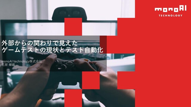 2 monoAI technology株式会社 第一QA部 技術支援セクション セクションマネージャー 花房 輝鑑(はなふさ てるあき) ゲームパブリッシャーや第三者検証会社などで、ゲーム・非ゲーム問わず 様々なテストに関わる。 属人的なゲームデバッグの現場から、テスト計画・戦略重視のソフトウェア テストの現場、現場でのプロジェクト管理から会社組織の運営・管理まで、 様々な経験。 2019年にモリカトロン株式会社に入社し、事業継承によりmonoAI technology 株式会社に転籍。 現在、テスト設計体制の構築、教育体制・教育制度の構築など、技術的な 支援を中心に活動中。