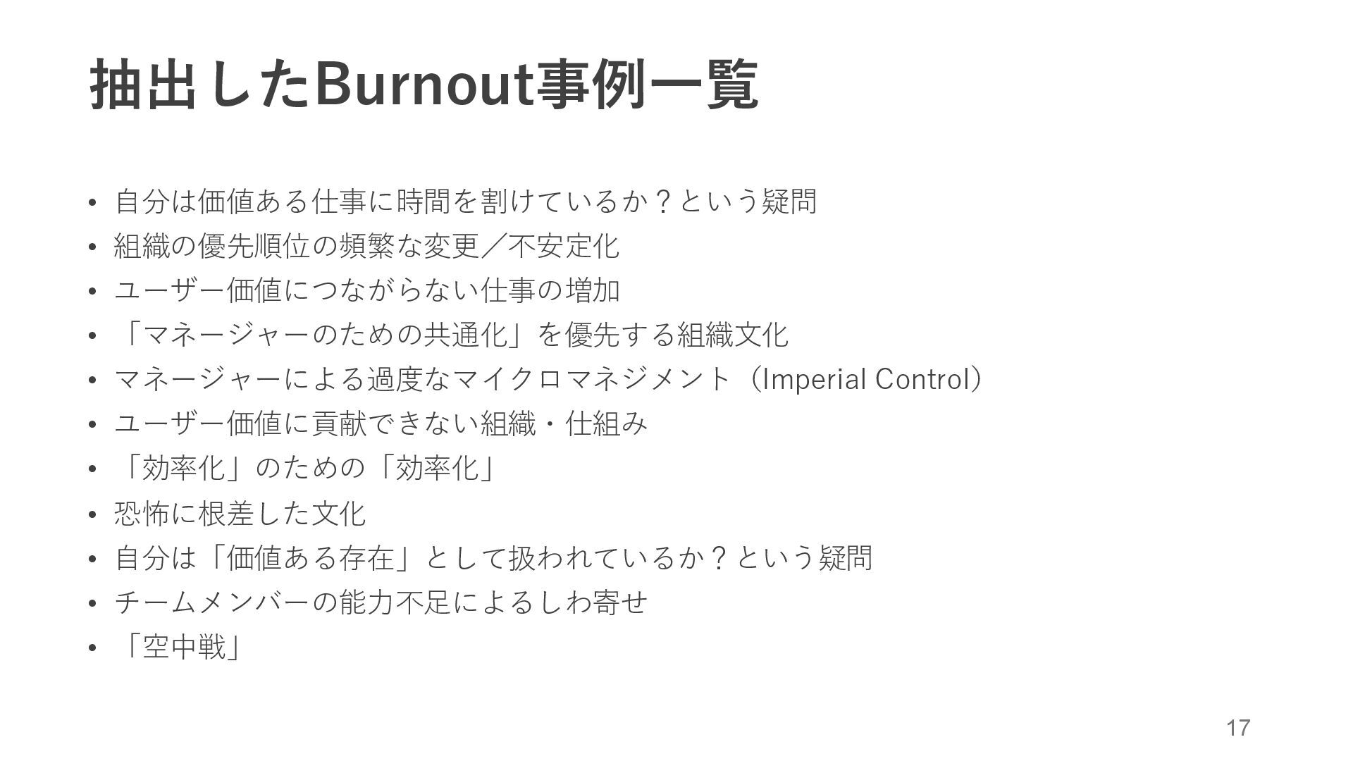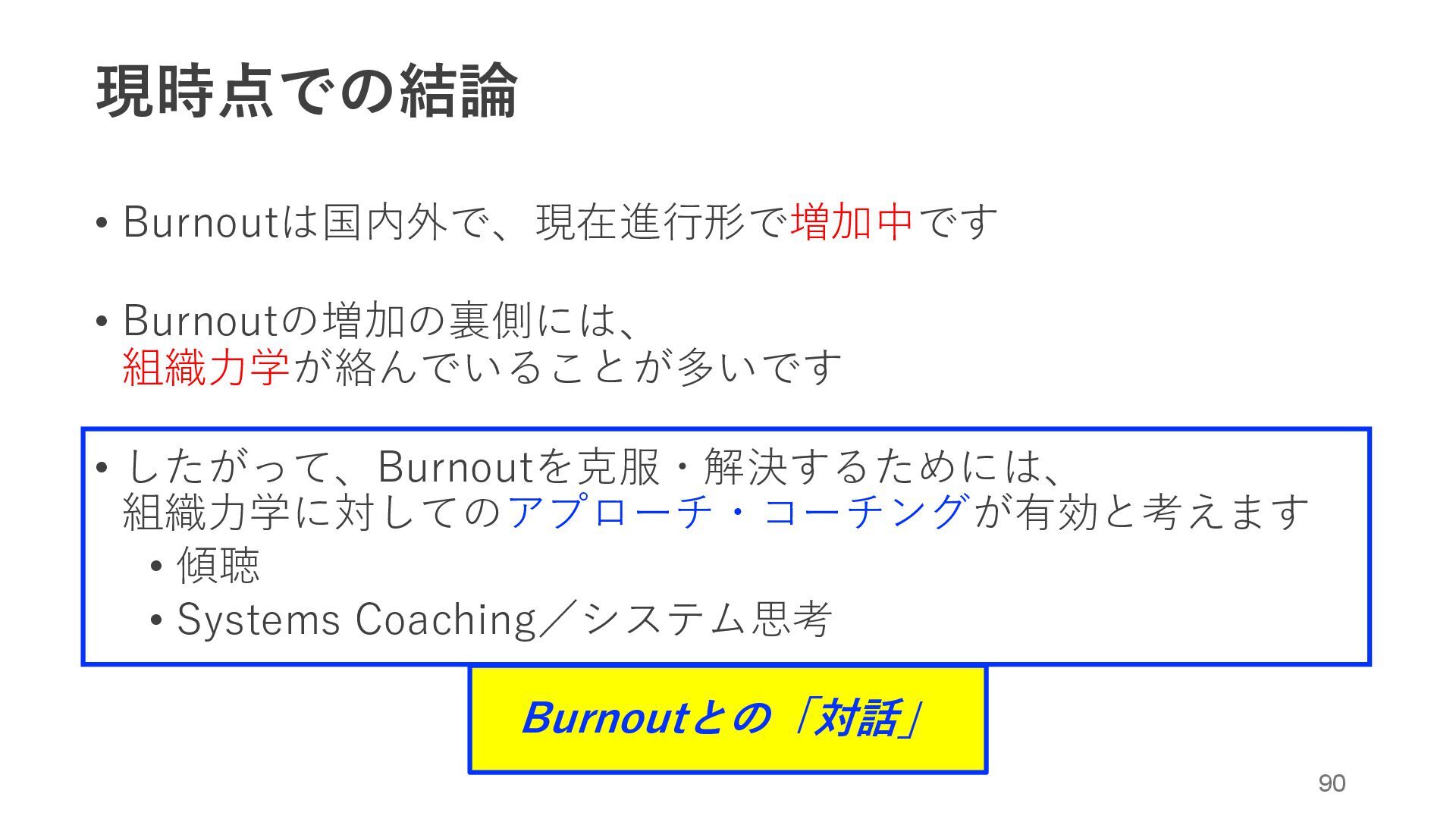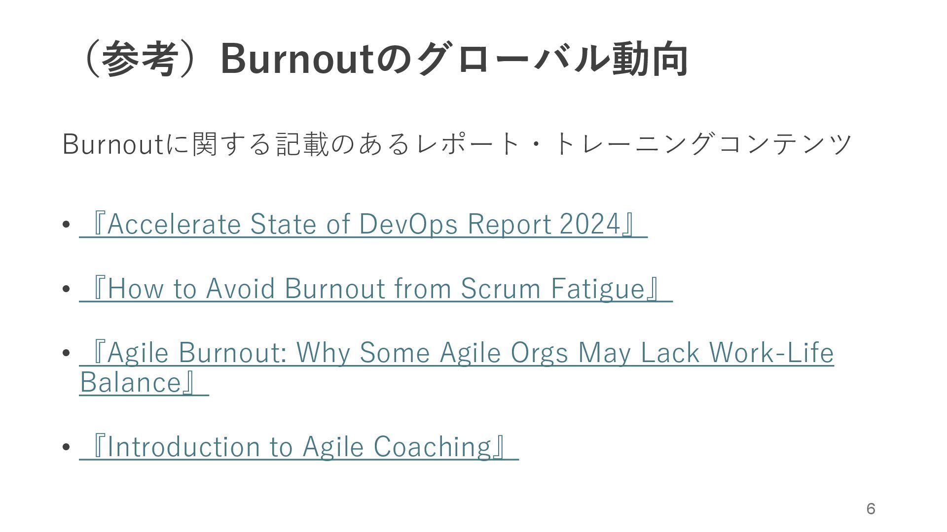 当資料では、アジャイルコーチングの知識・スキルを活用して、Burnoutから身を守る方法を、実例込みで紹介しています。