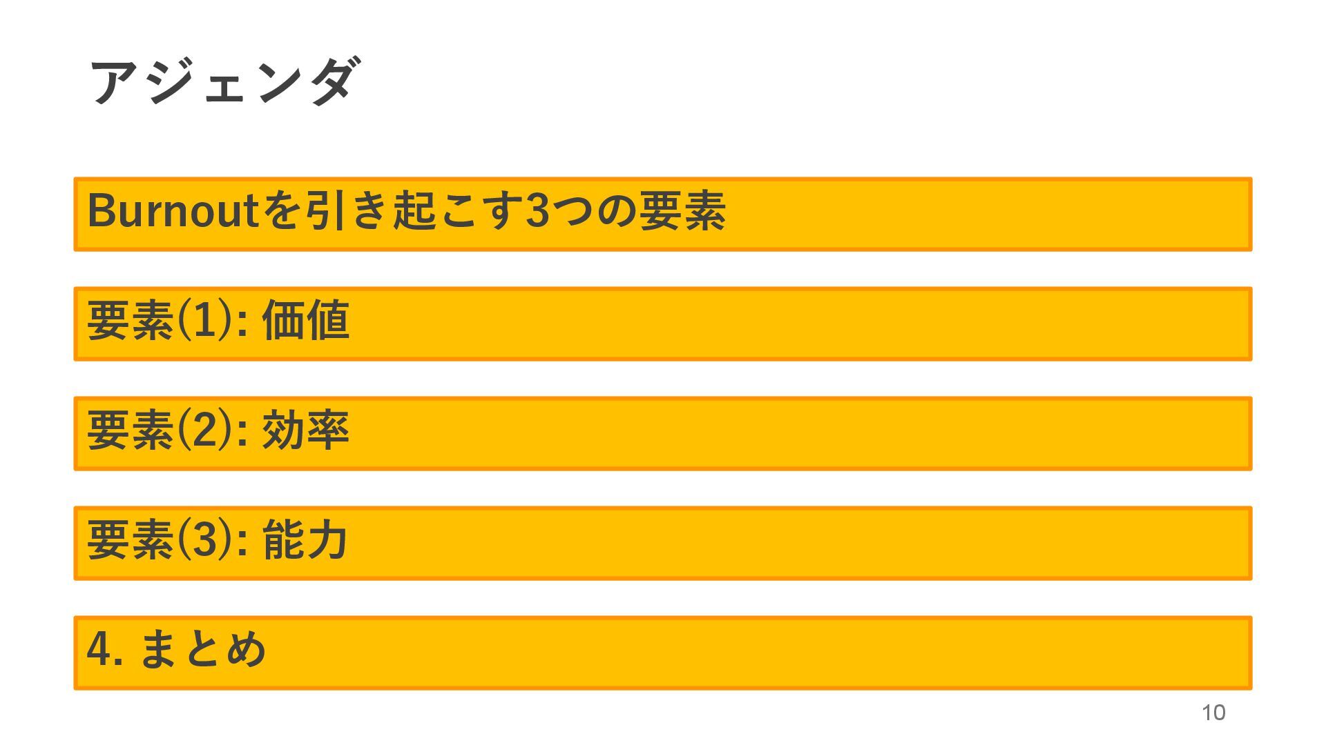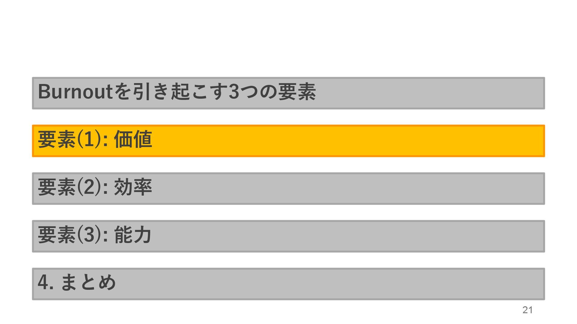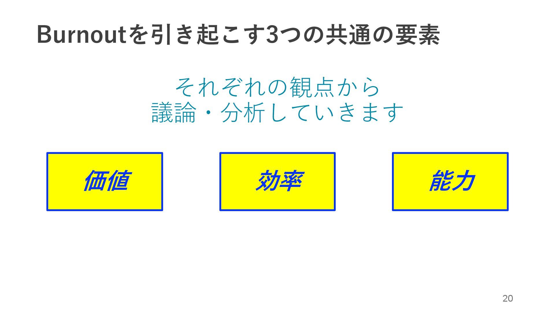 より具体的には、Burnoutを引き起こす要素を (1) 価値、(2) 効率、(3) 能力の3つに分解し、