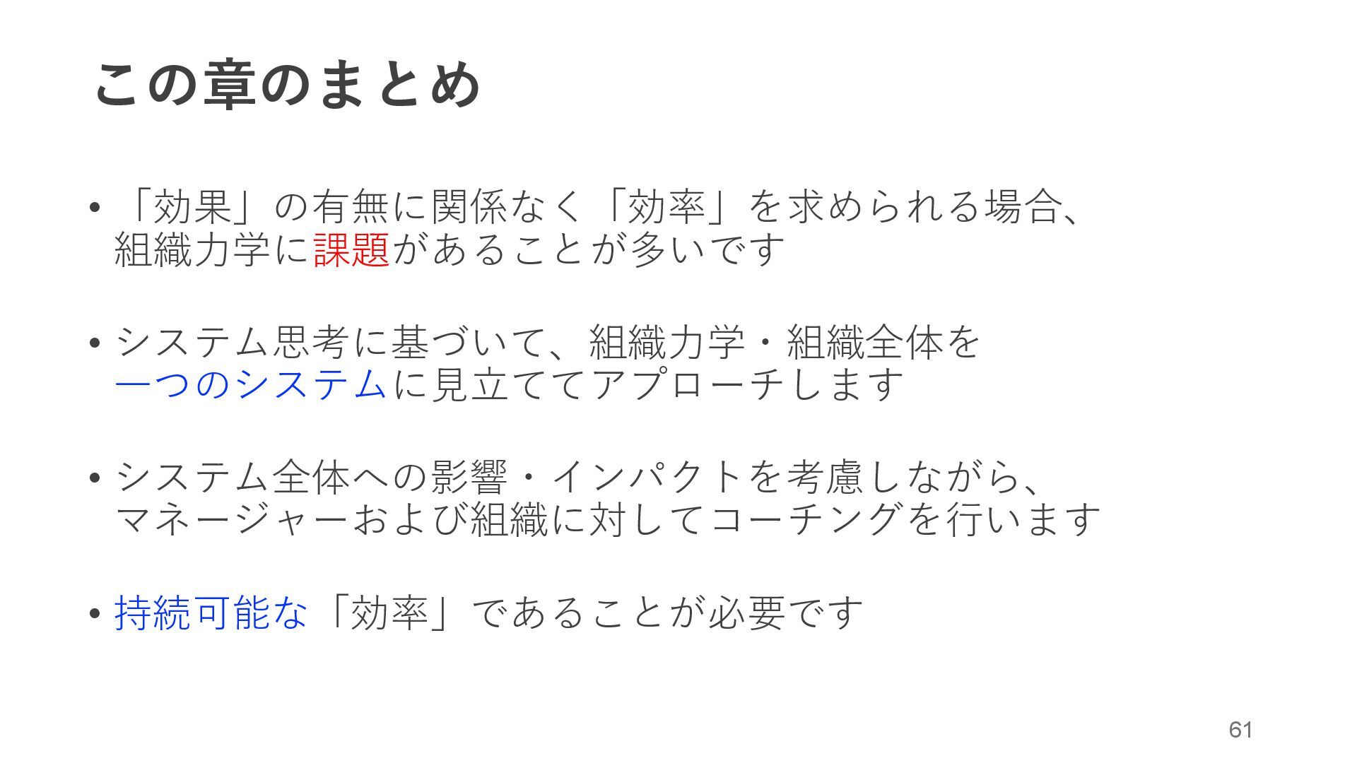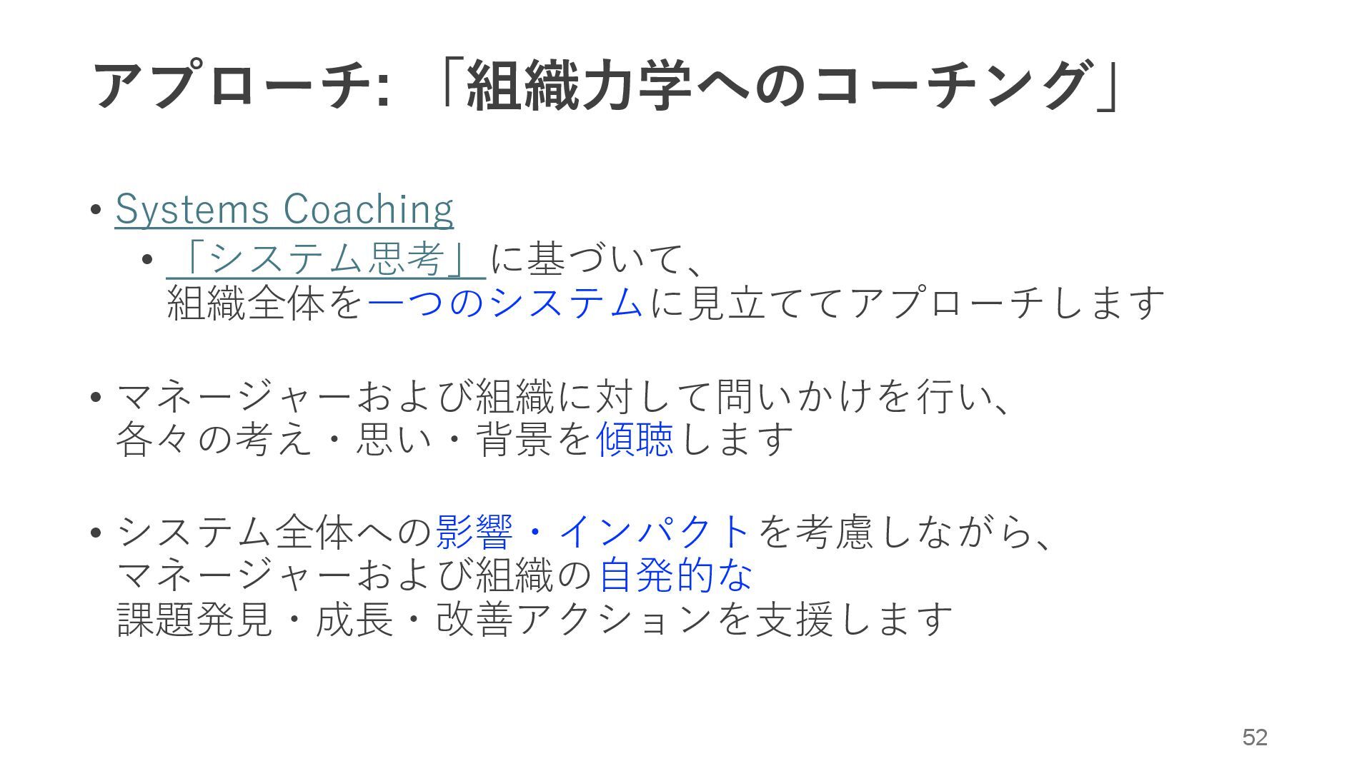 加えて、組織力学の課題に対して、Systems Coaching、システム思考、および組織に対する傾聴を活用し、組織全体を一つのシステムとみなすアプローチとその有効性についても説明しています。