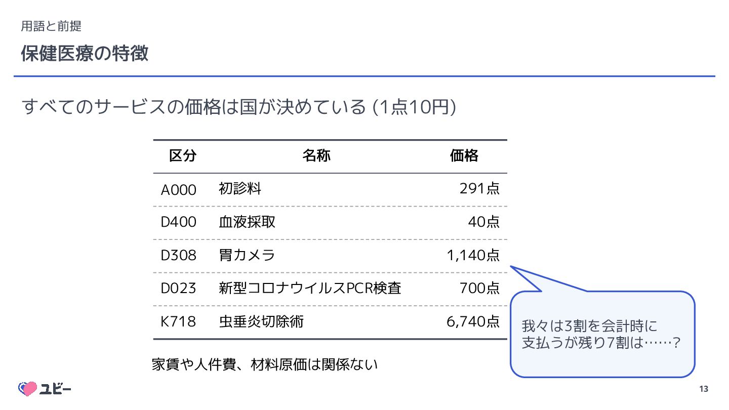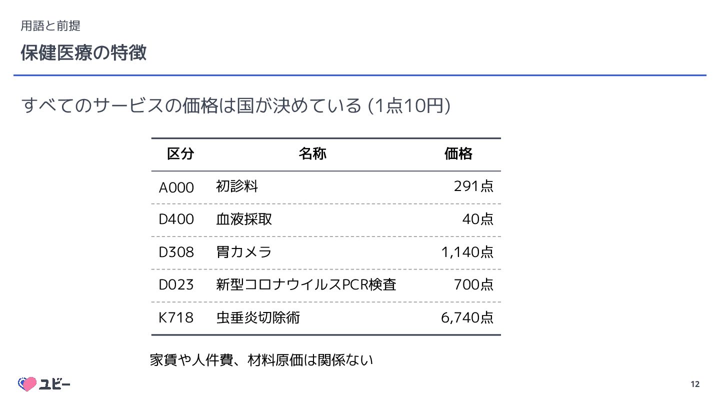 4. 12 保健医療の特徴 用語と前提 すべてのサービスの価格は国が決めている (1点10円) 家賃や人件費、材料原価は関係ない 区分 名称 価格 A000