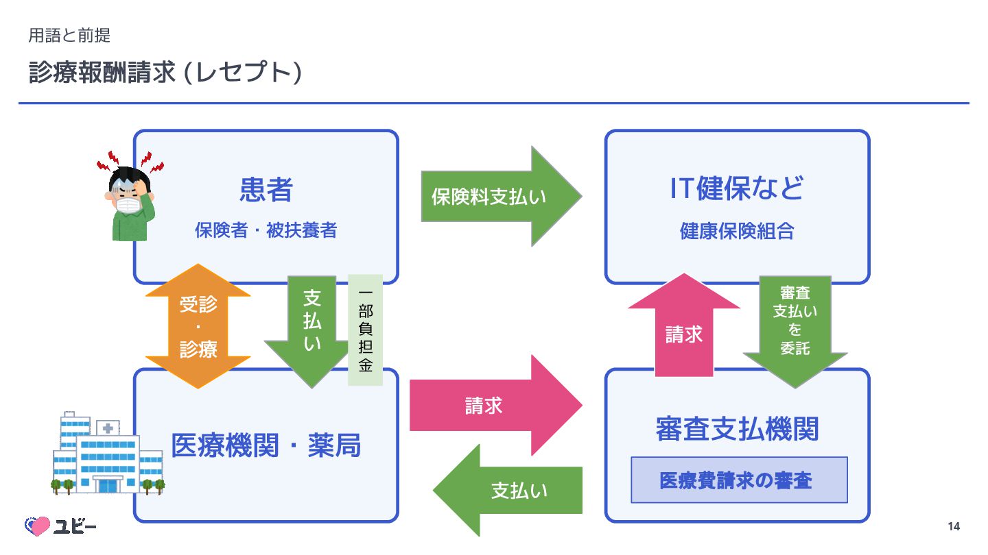 6. 14 診療報酬請求 (レセプト) 用語と前提 患者 保険者・被扶養者 医療機関・薬局 IT健保など 健康保険組合 審査支払機関