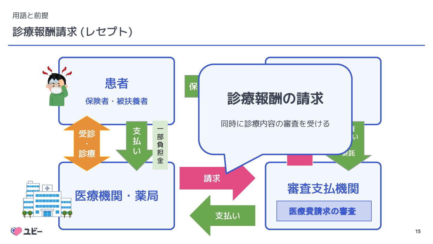 7. 15 診療報酬請求 (レセプト) 用語と前提 患者 保険者・被扶養者 医療機関・薬局 IT健保など 健康保険組合 審査支払機関