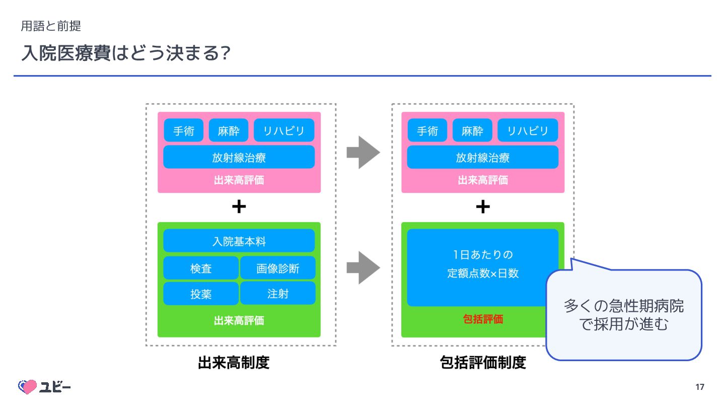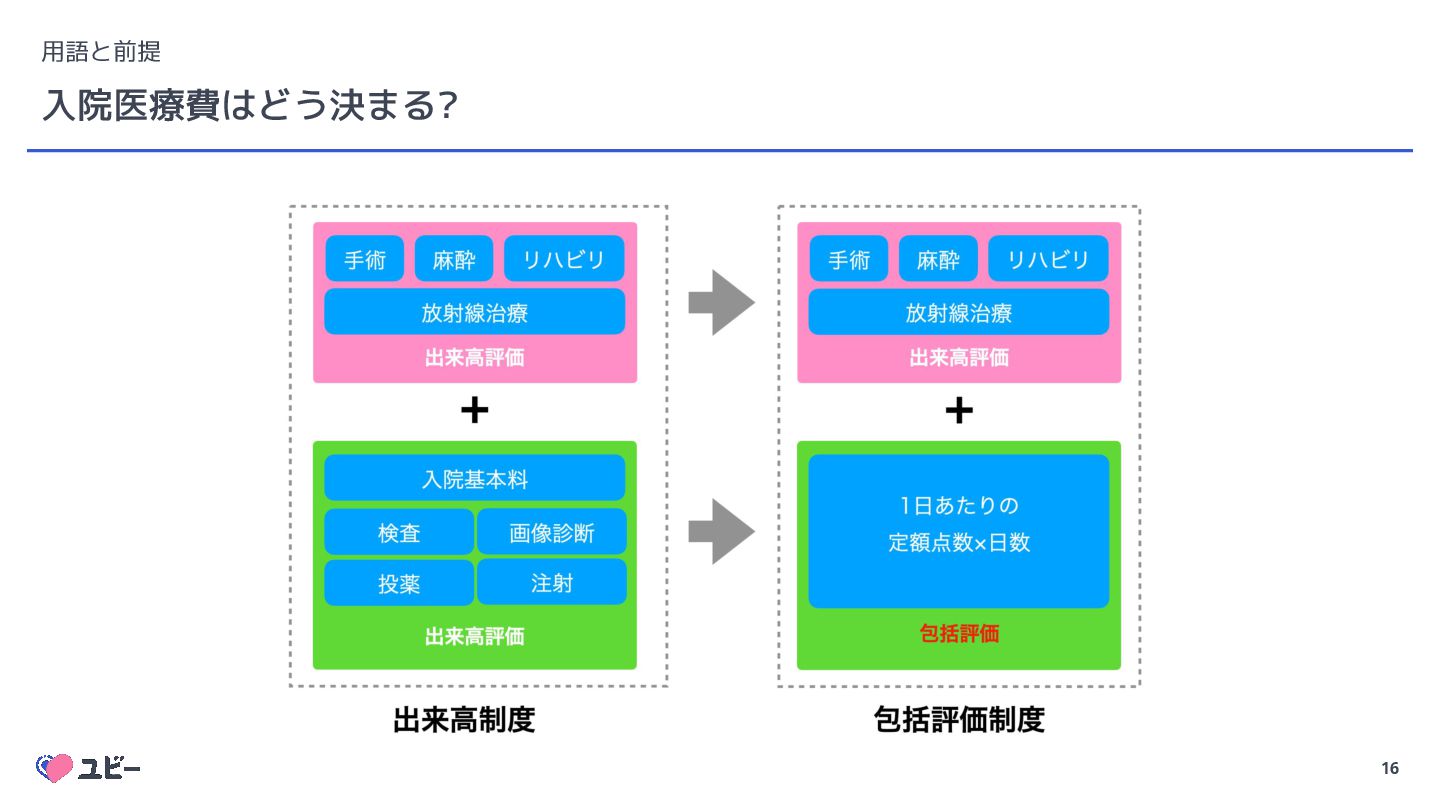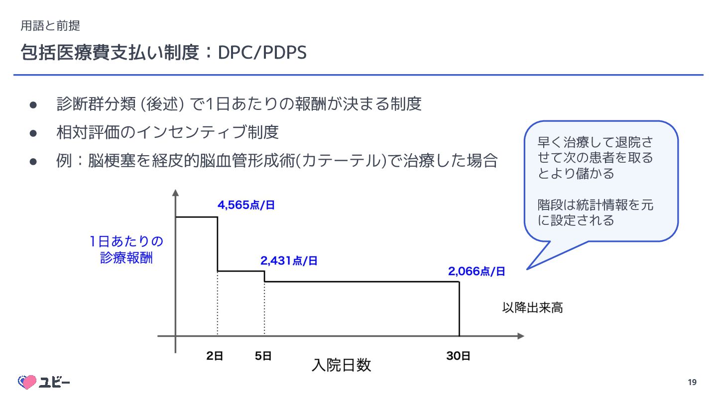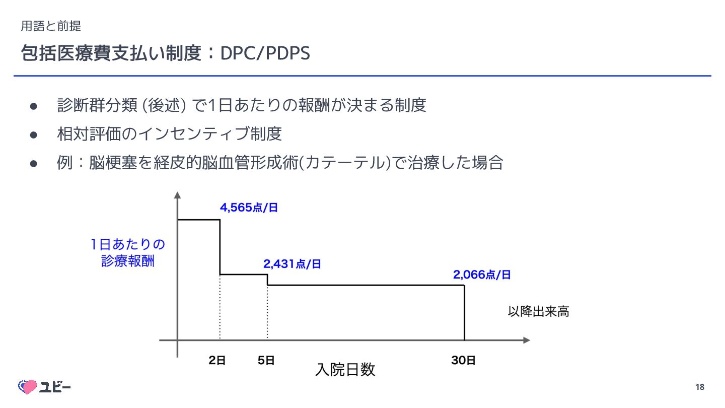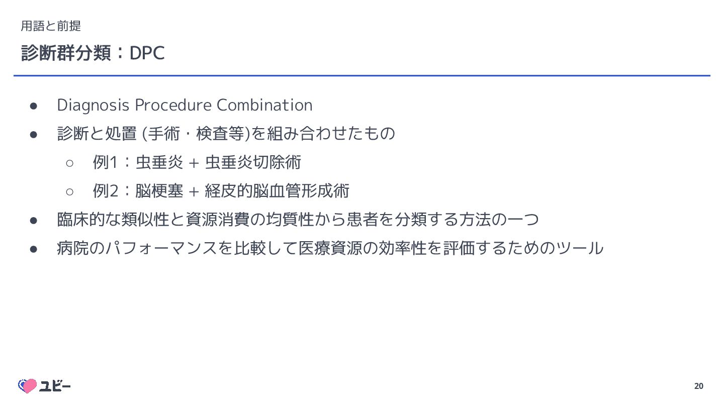 例1:虫垂炎 + 虫垂炎切除術 ◦ 例2:脳梗塞 + 経皮的脳血管形成術 • 臨床的な類似性と資源消費の均質性から患者を分類する方法の一つ • 病院のパフォーマンスを比較して医療資源の効率性を評価するためのツール 用語と前提