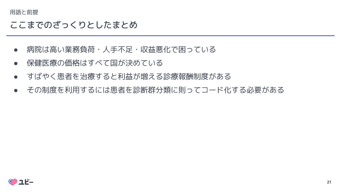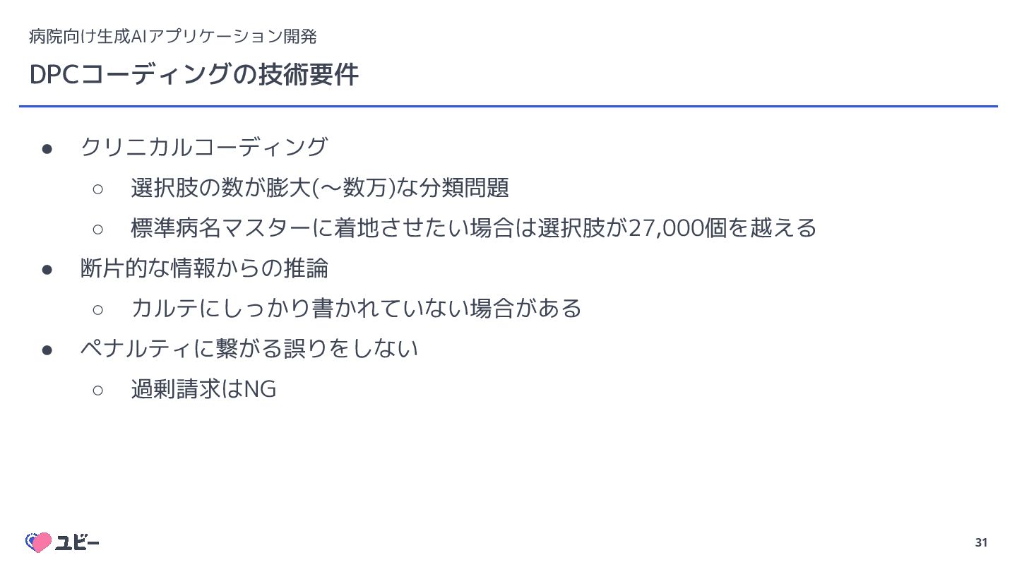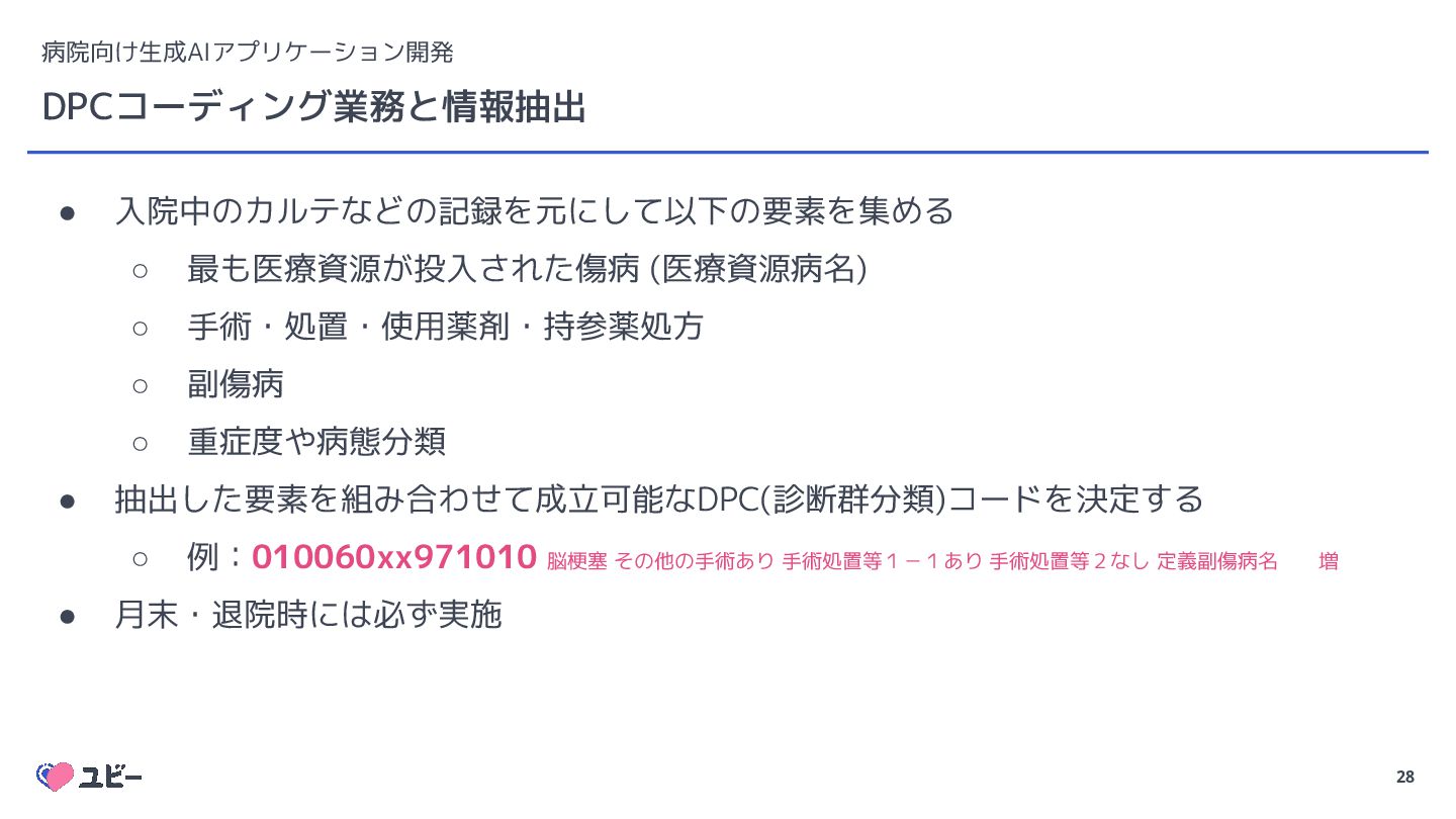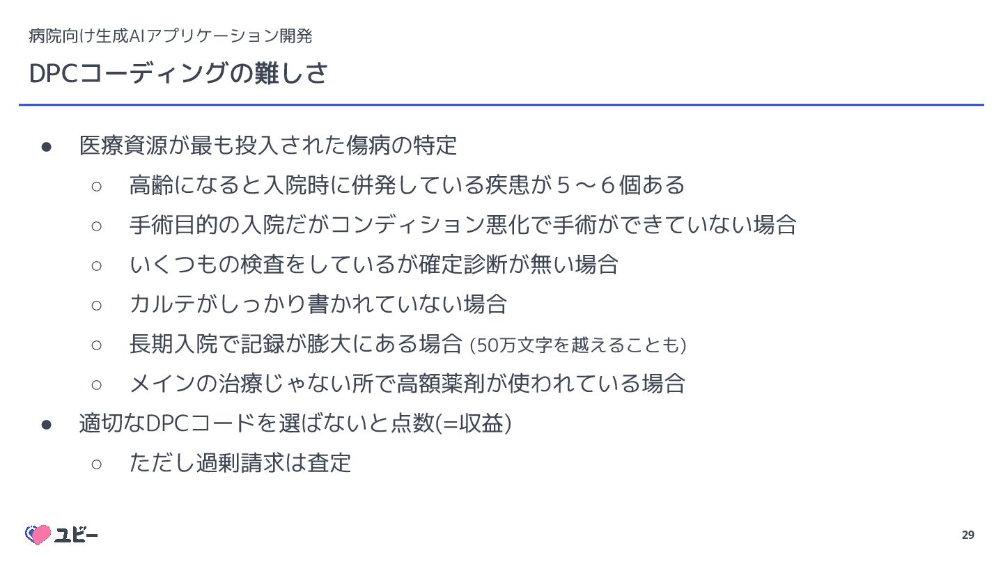 ◦ カルテがしっかり書かれていない場合 ◦ 長期入院で記録が膨大にある場合 (50万文字を越えることも) ◦ メインの治療じゃない所で高額薬剤が使われている場合 • 適切なDPCコードを選ばないと点数(=収益)が減りがち ◦ ただし過剰請求は査定 病院向け生成AIアプリケーション開発