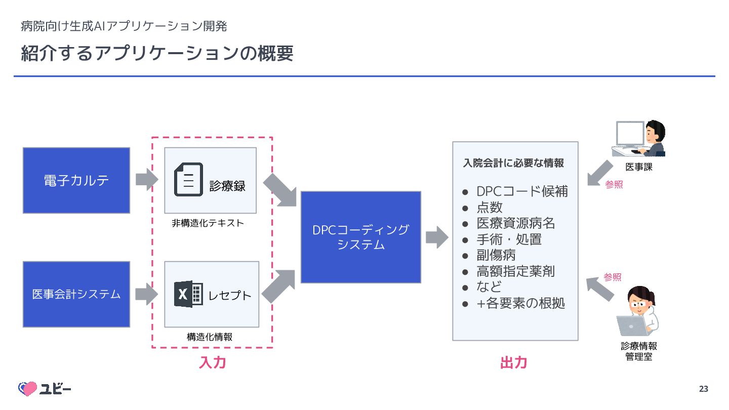 9. 23 紹介するアプリケーションの概要 病院向け生成AIアプリケーション開発 電子カルテ 医事会計システム DPCコーディング システム 診療録 レセプト 入力