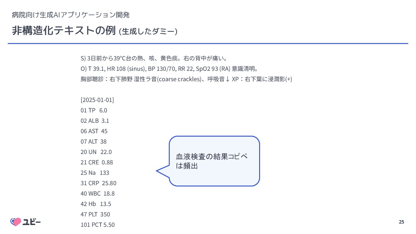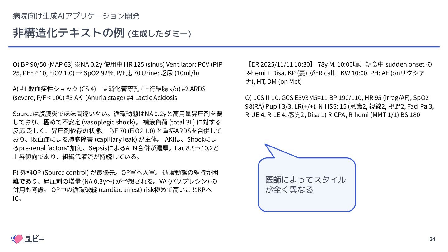 10. 24 非構造化テキストの例 (生成したダミー) 病院向け生成AIアプリケーション開発 【ER 2025/11/11 10:30】 78y M. 10:00頃、朝⾷中
