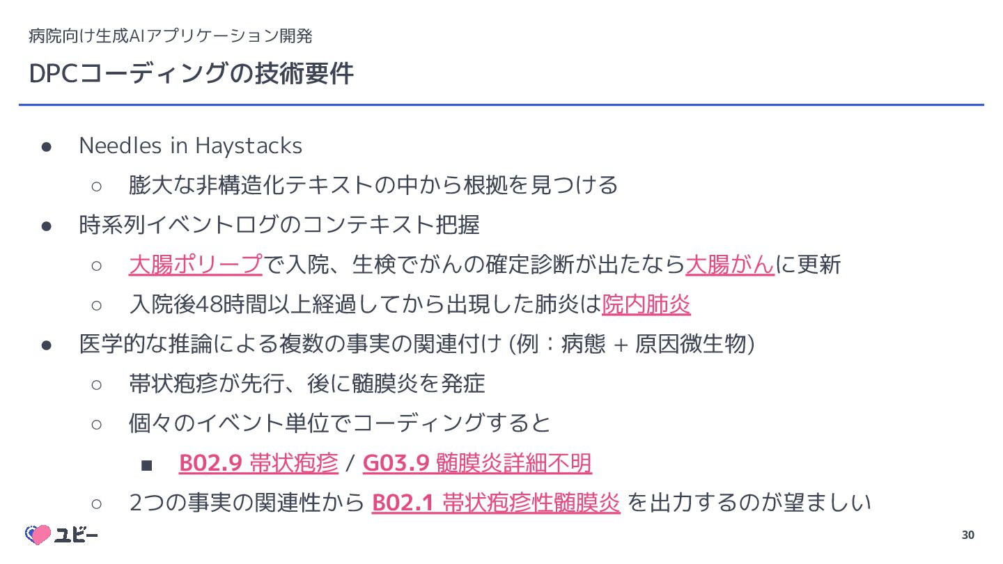 ◦ 大腸ポリープで入院、生検でがんの確定診断が出たなら大腸がんに更新 ◦ 入院後48時間以上経過してから出現した肺炎は院内肺炎 • 医学的な推論による複数の事実の関連付け (例:病態 + 原因微生物) ◦ 帯状疱疹が先行、後に髄膜炎を発症 ◦ 個々のイベント単位でコーディングすると ▪ B02.9 帯状疱疹 / G03.9 髄膜炎詳細不明 ◦ 2つの事実の関連性から B02.1 帯状疱疹性髄膜炎 を出力するのが望ましい 病院向け生成AIアプリケーション開発