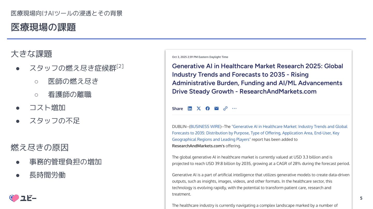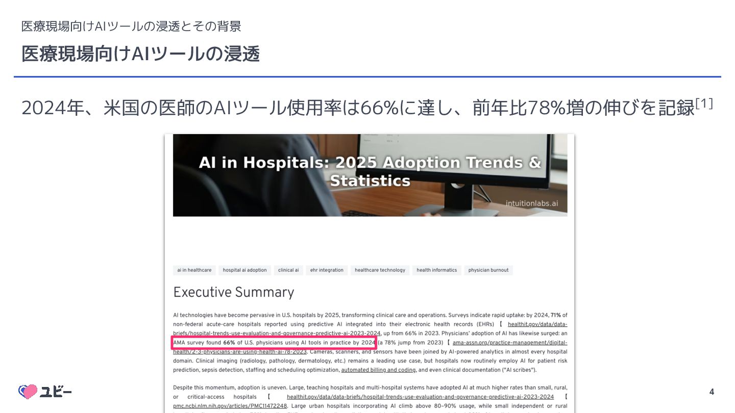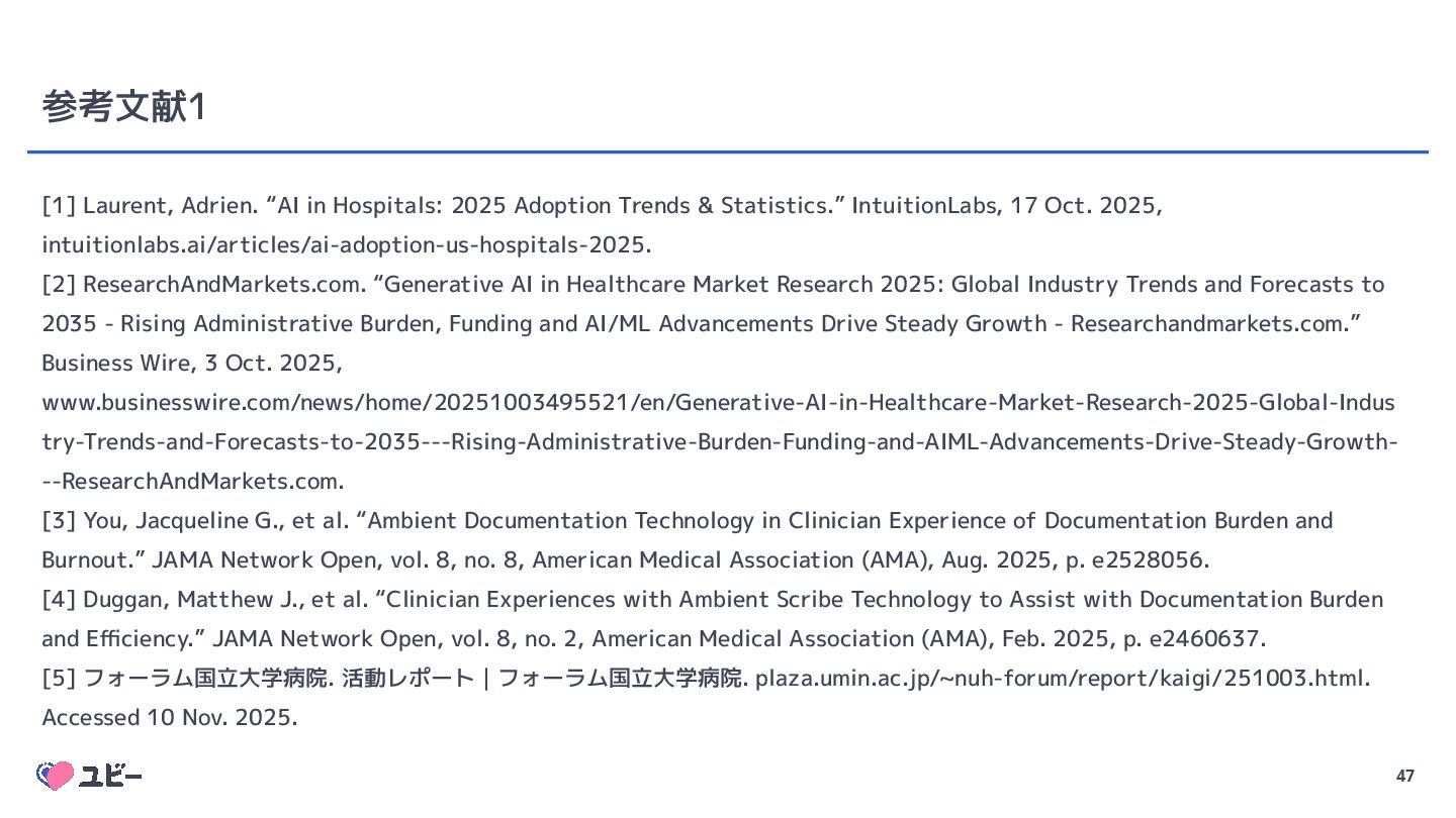 Trends & Statistics.” IntuitionLabs, 17 Oct. 2025, intuitionlabs.ai/articles/ai-adoption-us-hospitals-2025. [2] ResearchAndMarkets.com. “Generative AI in Healthcare Market Research 2025: Global Industry Trends and Forecasts to 2035 - Rising Administrative Burden, Funding and AI/ML Advancements Drive Steady Growth - Researchandmarkets.com.” Business Wire, 3 Oct. 2025, www.businesswire.com/news/home/20251003495521/en/Generative-AI-in-Healthcare-Market-Research-2025-Global-Indus try-Trends-and-Forecasts-to-2035---Rising-Administrative-Burden-Funding-and-AIML-Advancements-Drive-Steady-Growth- --ResearchAndMarkets.com. [3] You, Jacqueline G., et al. “Ambient Documentation Technology in Clinician Experience of Documentation Burden and Burnout.” JAMA Network Open, vol. 8, no. 8, American Medical Association (AMA), Aug. 2025, p. e2528056. [4] Duggan, Matthew J., et al. “Clinician Experiences with Ambient Scribe Technology to Assist with Documentation Burden and Efficiency.” JAMA Network Open, vol. 8, no. 2, American Medical Association (AMA), Feb. 2025, p. e2460637. [5] フォーラム国立大学病院. 活動レポート|フォーラム国立大学病院. plaza.umin.ac.jp/~nuh-forum/report/kaigi/251003.html. Accessed 10 Nov. 2025.