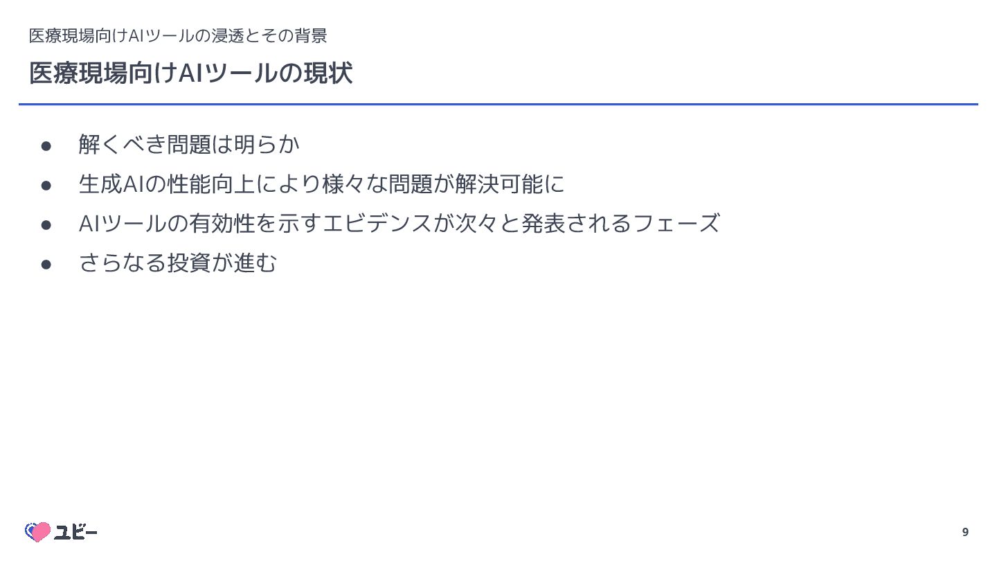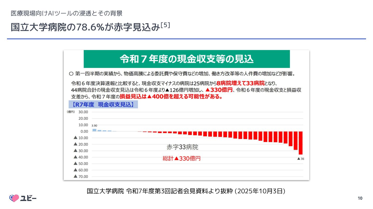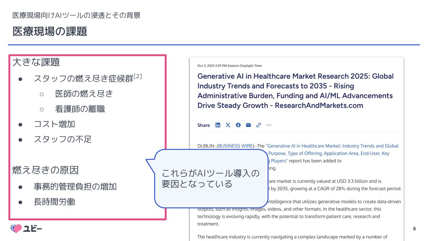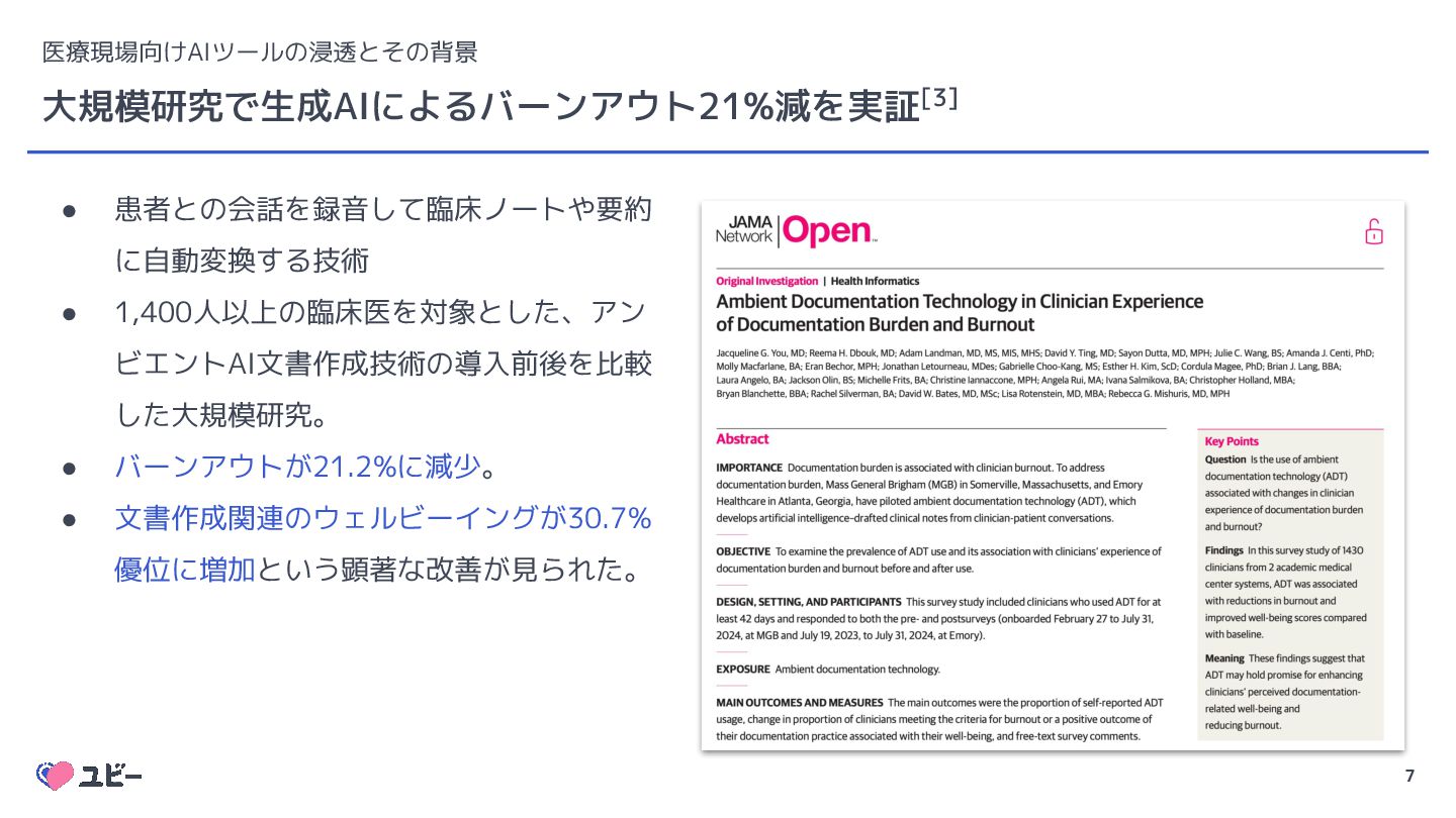 Trends & Statistics.” IntuitionLabs, 17 Oct. 2025, intuitionlabs.ai/articles/ai-adoption-us-hospitals-2025. [2] ResearchAndMarkets.com. “Generative AI in Healthcare Market Research 2025: Global Industry Trends and Forecasts to 2035 - Rising Administrative Burden, Funding and AI/ML Advancements Drive Steady Growth - Researchandmarkets.com.” Business Wire, 3 Oct. 2025, www.businesswire.com/news/home/20251003495521/en/Generative-AI-in-Healthcare-Market-Research-2025-Global-Indus try-Trends-and-Forecasts-to-2035---Rising-Administrative-Burden-Funding-and-AIML-Advancements-Drive-Steady-Growth- --ResearchAndMarkets.com. [3] You, Jacqueline G., et al. “Ambient Documentation Technology in Clinician Experience of Documentation Burden and Burnout.” JAMA Network Open, vol. 8, no. 8, American Medical Association (AMA), Aug. 2025, p. e2528056. [4] Duggan, Matthew J., et al. “Clinician Experiences with Ambient Scribe Technology to Assist with Documentation Burden and Efficiency.” JAMA Network Open, vol. 8, no. 2, American Medical Association (AMA), Feb. 2025, p. e2460637. [5] フォーラム国立大学病院. 活動レポート|フォーラム国立大学病院. plaza.umin.ac.jp/~nuh-forum/report/kaigi/251003.html. Accessed 10 Nov. 2025.