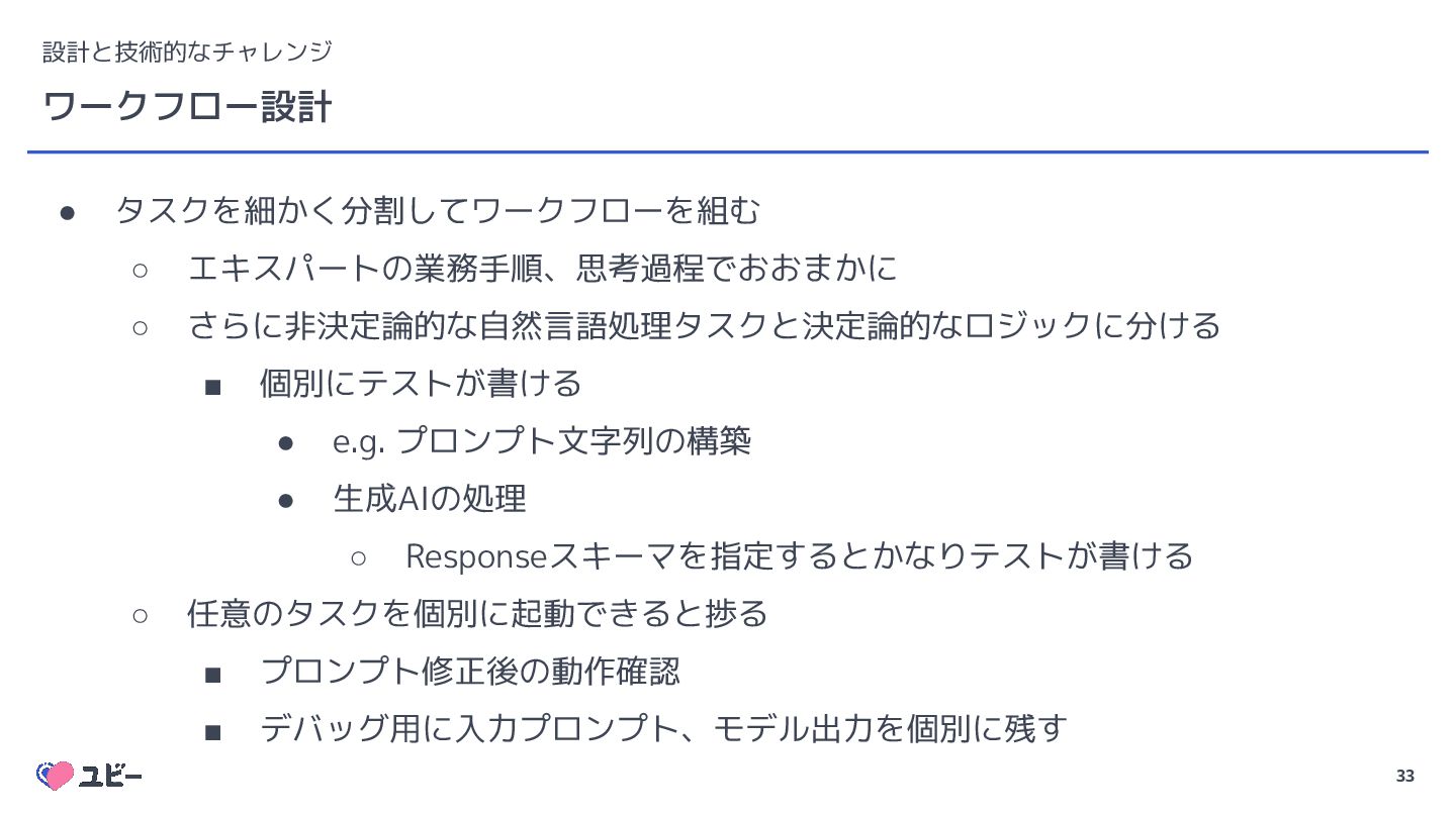 18. 33 • タスクを細かく分割してワークフローを組む ◦ エキスパートの業務手順、思考過程でおおまかに ◦ さらに非決定論的な自然言語処理タスクと決定論的なロジックに分ける ▪ 個別にテストが書ける •