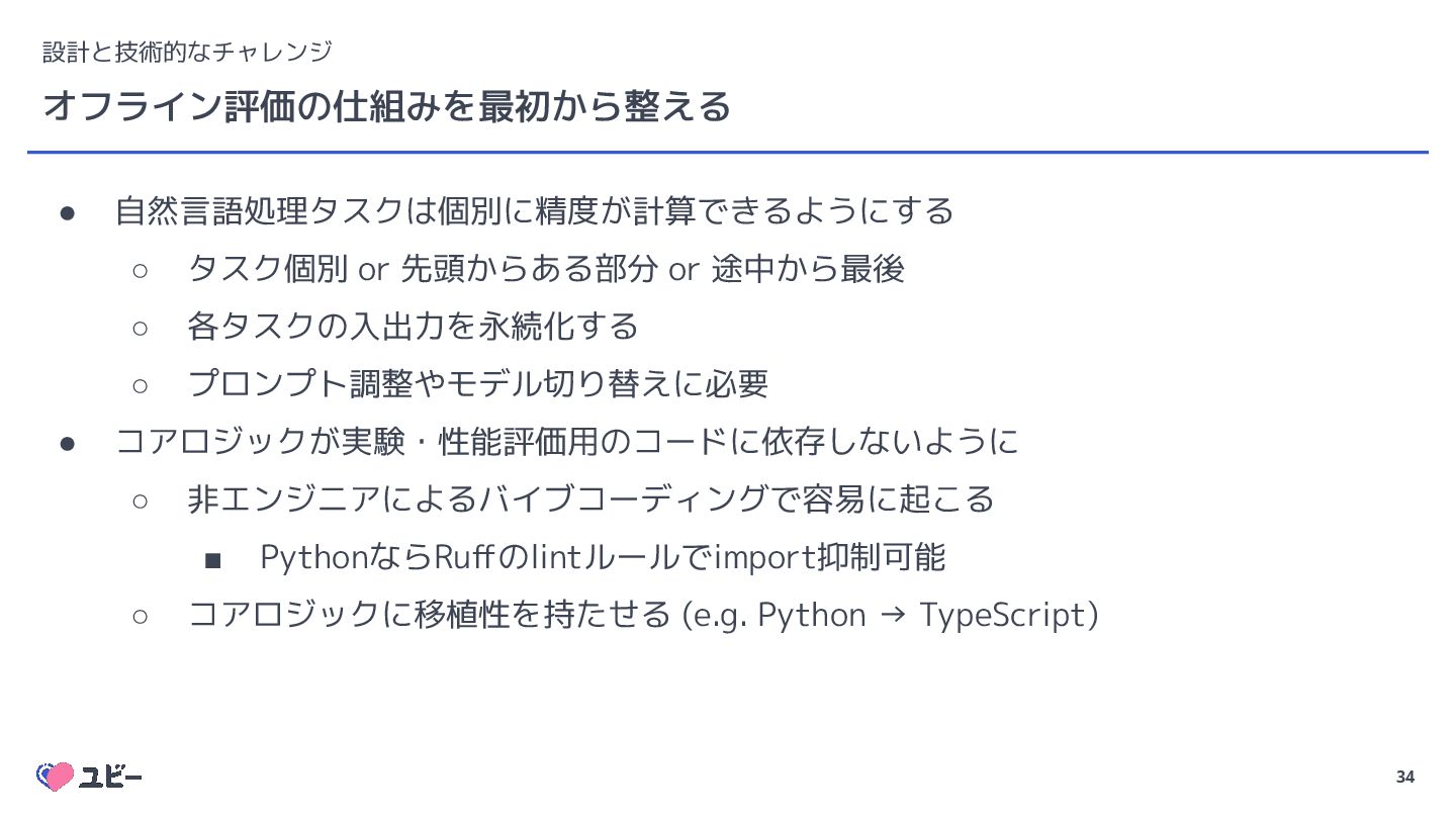 ◦ 各タスクの入出力を永続化する ◦ プロンプト調整やモデル切り替えに必要 • コアロジックが実験・性能評価用のコードに依存しないように ◦ 非エンジニアによるバイブコーディングで容易に起こる ▪ PythonならRuffのlintルールでimport抑制可能 ◦ コアロジックに移植性を持たせる (e.g. Python → TypeScript) 設計と技術的なチャレンジ