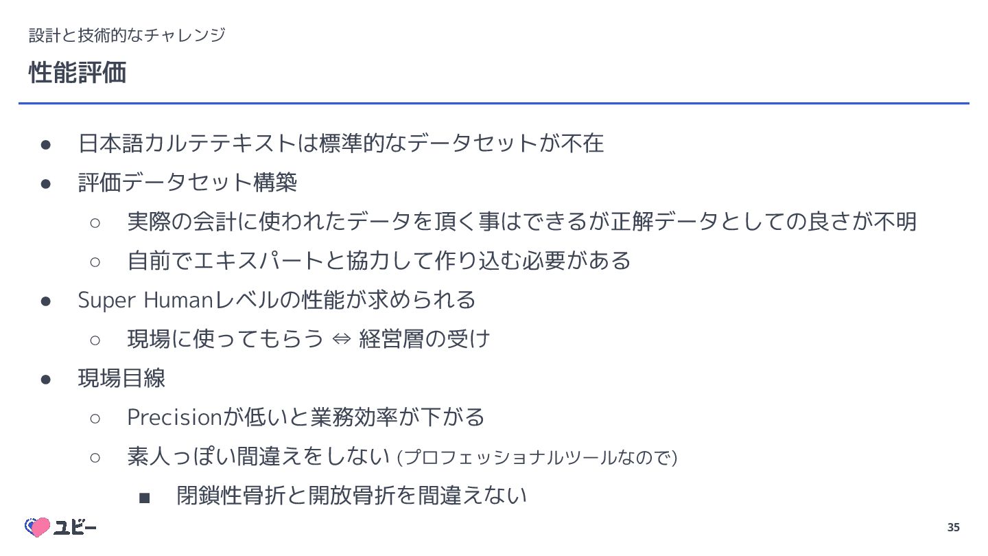 • Super Humanレベルの性能が求められる ◦ 現場に使ってもらう ⇔ 経営層の受け • 現場目線 ◦ Precisionが低いと業務効率が下がる ◦ 素人っぽい間違えをしない (プロフェッショナルツールなので) ▪ 閉鎖性骨折と開放骨折を間違えない 設計と技術的なチャレンジ