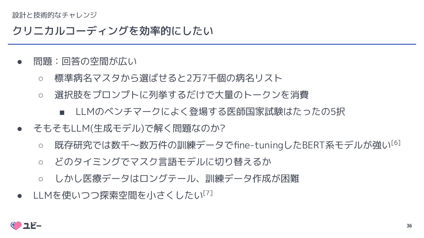 そもそもLLM(生成モデル)で解く問題なのか? ◦ 既存研究では数千〜数万件の訓練データでfine-tuningしたBERT系モデルが強い[6] ◦ どのタイミングでマスク言語モデルに切り替えるか ◦ しかし医療データはロングテール、訓練データ作成が困難 • LLMを使いつつ探索空間を小さくしたい[7] クリニカルコーディングを効率的にしたい 設計と技術的なチャレンジ