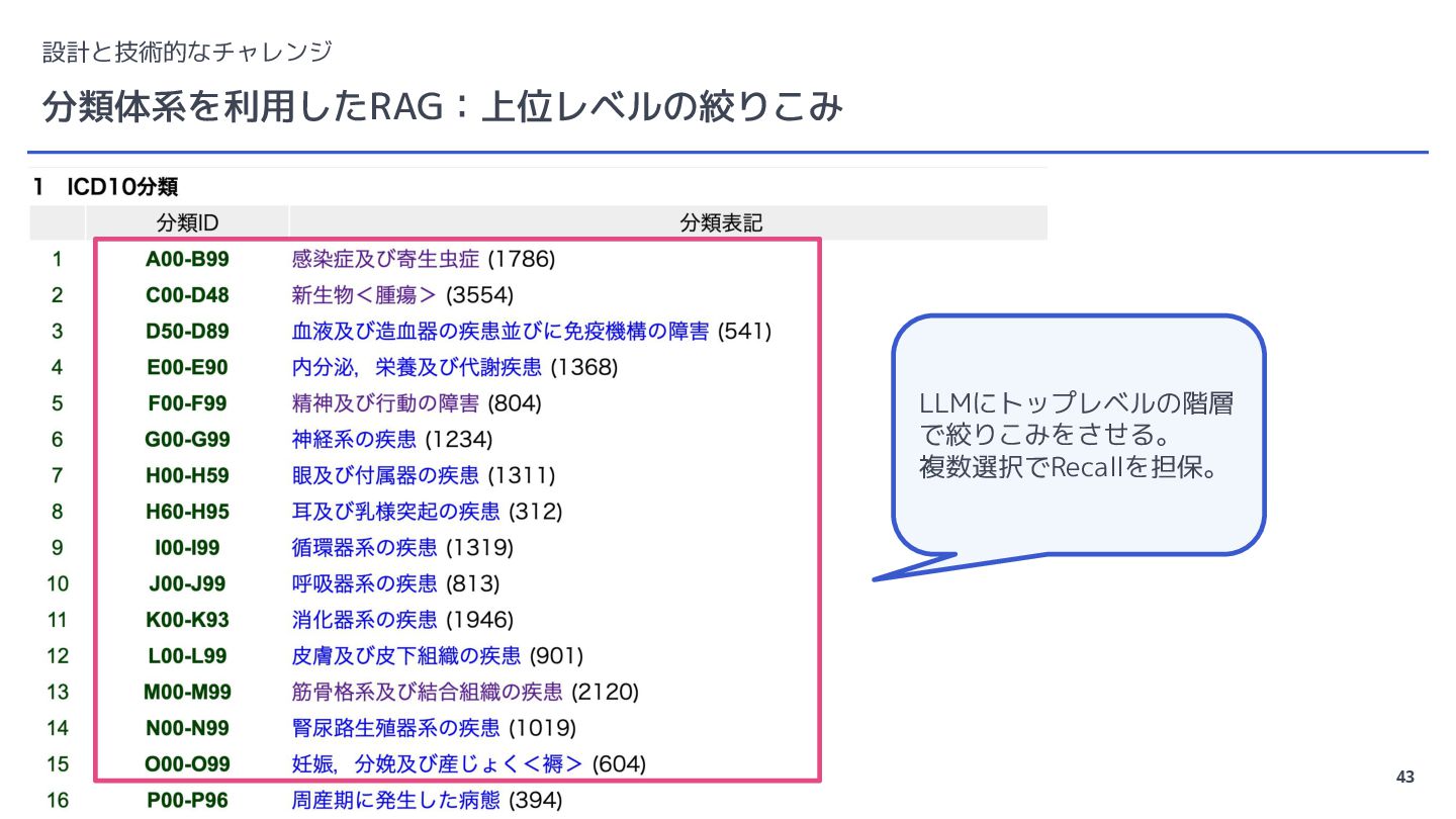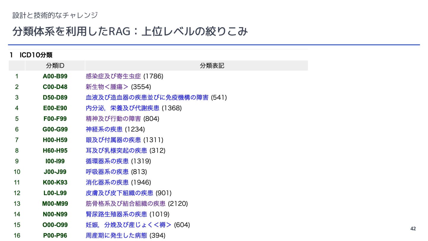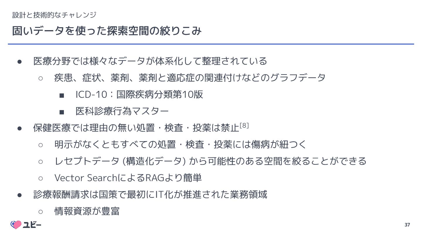 • 保健医療では理由の無い処置・検査・投薬は禁止[8] ◦ 明示がなくともすべての処置・検査・投薬には傷病が紐つく ◦ レセプトデータ (構造化データ) から可能性のある空間を絞ることができる ◦ Vector SearchによるRAGより簡単 • 診療報酬請求は国策で最初にIT化が推進された業務領域 ◦ 情報資源が豊富 設計と技術的なチャレンジ