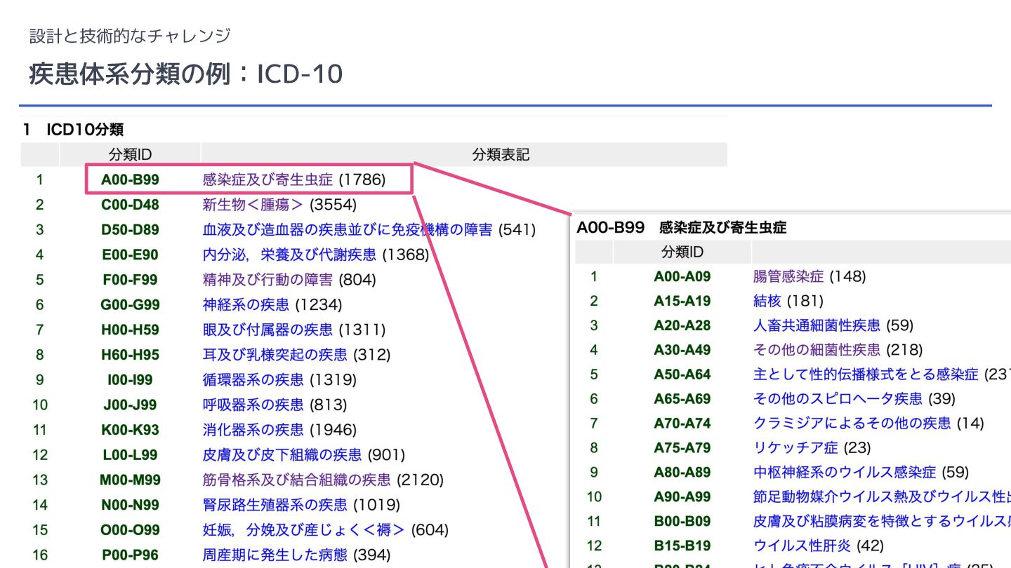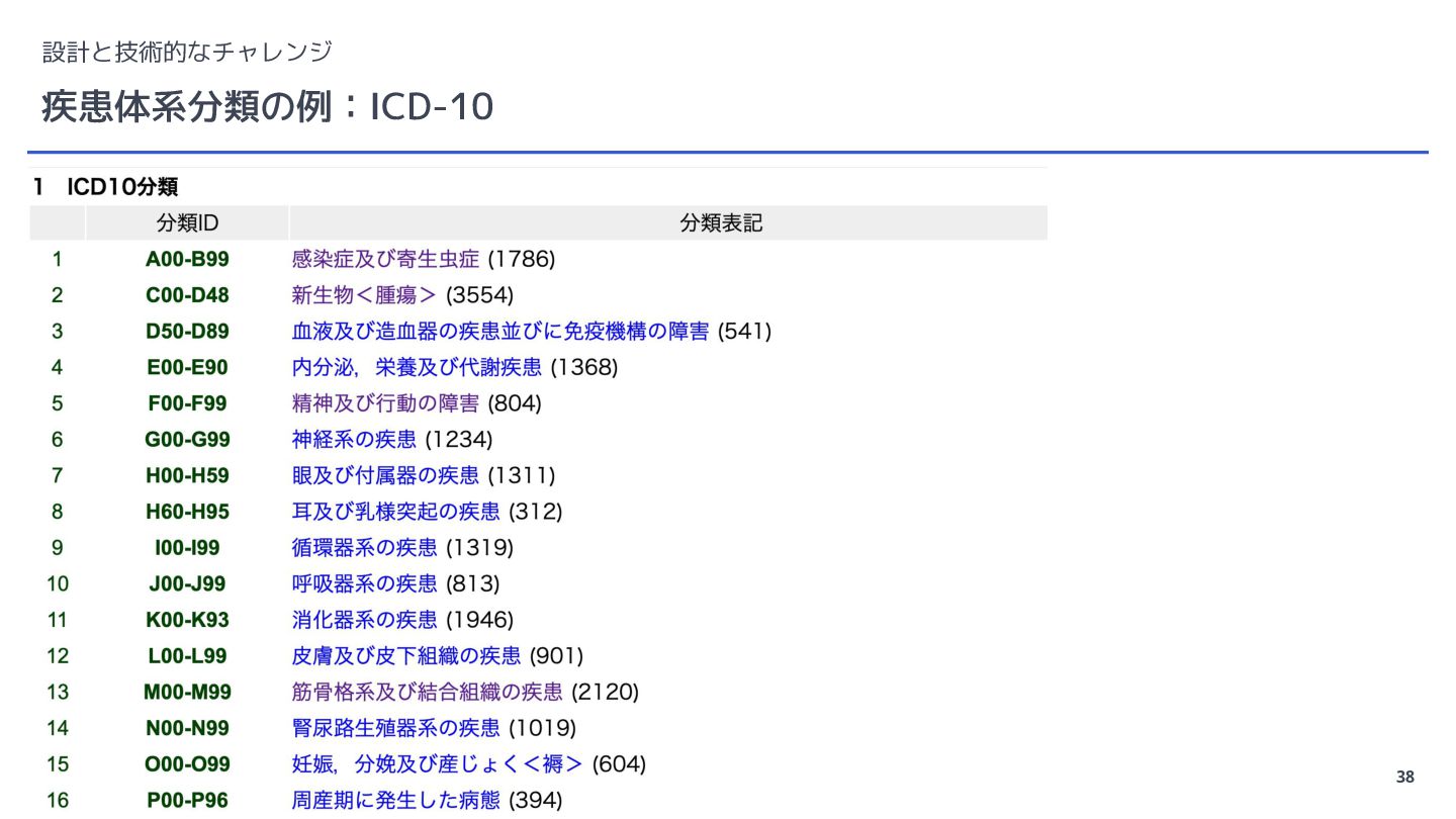 22. 37 固いデータを使った探索空間の絞りこみ • 医療分野では様々なデータが体系化して整理されている ◦ 疾患、症状、薬剤、薬剤と適応症の関連付けなどのグラフデータ ▪ ICD-10:国際疾病分類第10版 ▪ 医科診療行為マスター