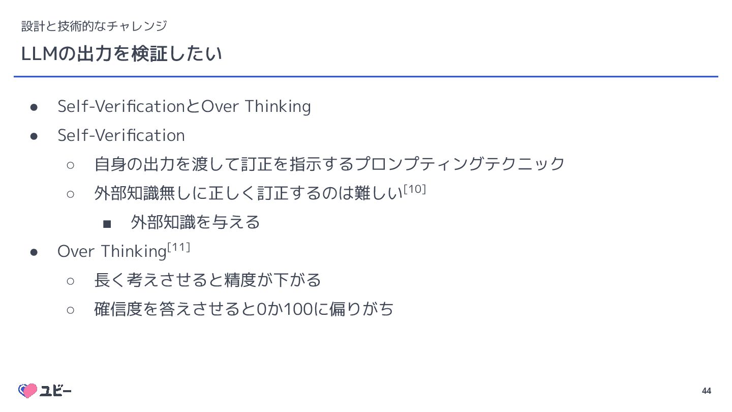 外部知識無しに正しく訂正するのは難しい[10] ▪ 外部知識を与える • Over Thinking[11] ◦ 長く考えさせると精度が下がる ◦ 確信度を答えさせると0か100に偏りがち 設計と技術的なチャレンジ
