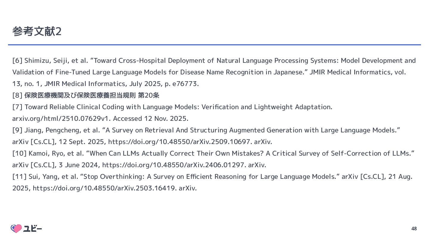 of Natural Language Processing Systems: Model Development and Validation of Fine-Tuned Large Language Models for Disease Name Recognition in Japanese.” JMIR Medical Informatics, vol. 13, no. 1, JMIR Medical Informatics, July 2025, p. e76773. [8] 保険医療機関及び保険医療養担当規則 第20条 [7] Toward Reliable Clinical Coding with Language Models: Verification and Lightweight Adaptation. arxiv.org/html/2510.07629v1. Accessed 12 Nov. 2025. [9] Jiang, Pengcheng, et al. “A Survey on Retrieval And Structuring Augmented Generation with Large Language Models.” arXiv [Cs.CL], 12 Sept. 2025, https://doi.org/10.48550/arXiv.2509.10697. arXiv. [10] Kamoi, Ryo, et al. “When Can LLMs Actually Correct Their Own Mistakes? A Critical Survey of Self-Correction of LLMs.” arXiv [Cs.CL], 3 June 2024, https://doi.org/10.48550/arXiv.2406.01297. arXiv. [11] Sui, Yang, et al. “Stop Overthinking: A Survey on Efficient Reasoning for Large Language Models.” arXiv [Cs.CL], 21 Aug. 2025, https://doi.org/10.48550/arXiv.2503.16419. arXiv.