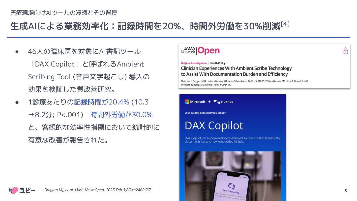 導入の 効果を検証した質改善研究。 • 1診療あたりの記録時間が20.4% (10.3 →8.2分; P<.001)、時間外労働が30.0% と、客観的な効率性指標において統計的に 有意な改善が報告された。 Duggan MJ, et al. JAMA Netw Open. 2025 Feb 3;8(2):e2460637.