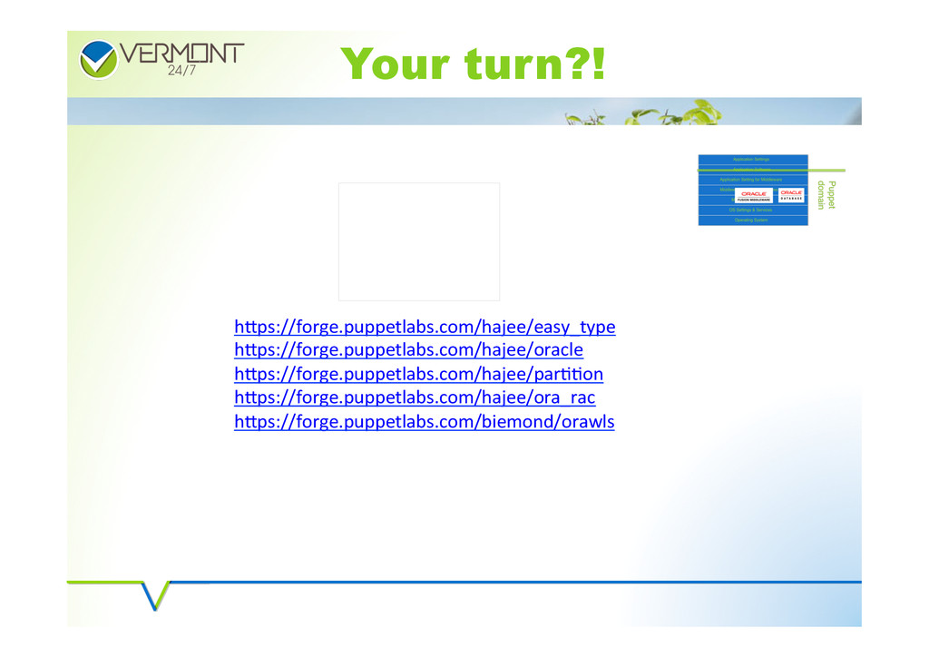Your turn?! h:ps://forge.puppetlabs.com/hajee/easy_type h:ps://forge.puppetlabs.com/hajee/oracle h:ps://forge.puppetlabs.com/hajee/parIIon h:ps://forge.puppetlabs.com/hajee/ora_rac