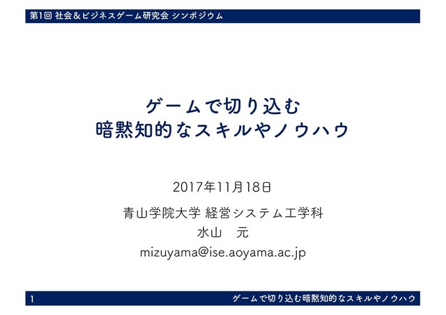 ήʔϜͰΓࠐΉ҉తͳεΩϧϊϋ ୈճ ࣾձˍϏδωεήʔϜݚڀձ γϯϙδϜ ήʔϜͰΓࠐΉ ҉తͳεΩϧϊϋ ݄ ੨ࢁֶӃେֶ ܦӦγεςϜֶՊ ਫࢁ