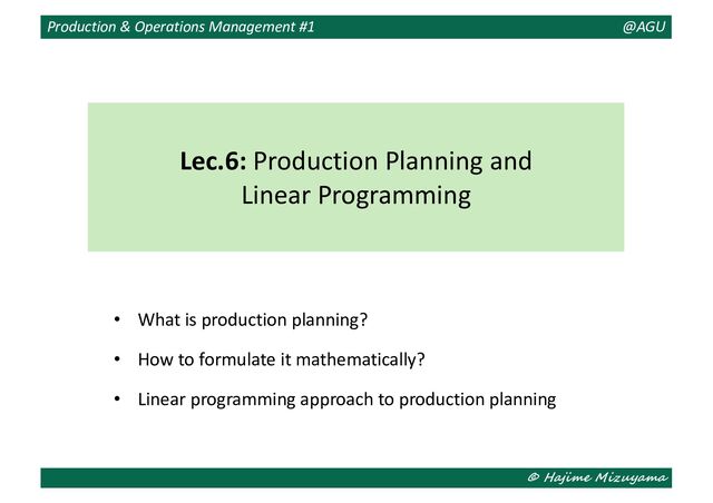 ⋯ , 𝑋!( , 𝑋"! , ⋯ ⋯ , 𝑋#( • 𝑌!! , 𝑌!" , ⋯ , 𝑌!()! , 𝑌"! , ⋯ ⋯ , 𝑌#()! (𝑌$* = 𝑌$( = 0 ∀𝑛) Objective function • 𝑃 = ∑$%! # ∑+%! ( 𝑝$ ( 𝑌$+)! + 𝑋$+ − 𝑌$+ − ∑$%! # ∑+%! ()! 𝑐$ ( 𝑌$+ Constraints • ∑$%! # ℎ$& ( 𝑋$+ ≤ 𝐻&+ (𝑚 = 1, 2, ⋯ , 𝑀; 𝑡 = 1, 2, ⋯ , 𝑇) • 𝐿$+ ≤ 𝑌$+ + 𝑋$+ − 𝑌$+ ≤ 𝑈$+ (𝑛 = 1, 2, ⋯ , 𝑁; 𝑡 = 1, 2, ⋯ , 𝑇) • 𝑋$+ ≥ 0, 𝑌$+ ≥ 0 (𝑛 = 1, 2, ⋯ , 𝑁; 𝑡 = 1, 2, ⋯ , 𝑇) Mathematical Formulation: Multi-Period Problem #2 ⇒ Maximize