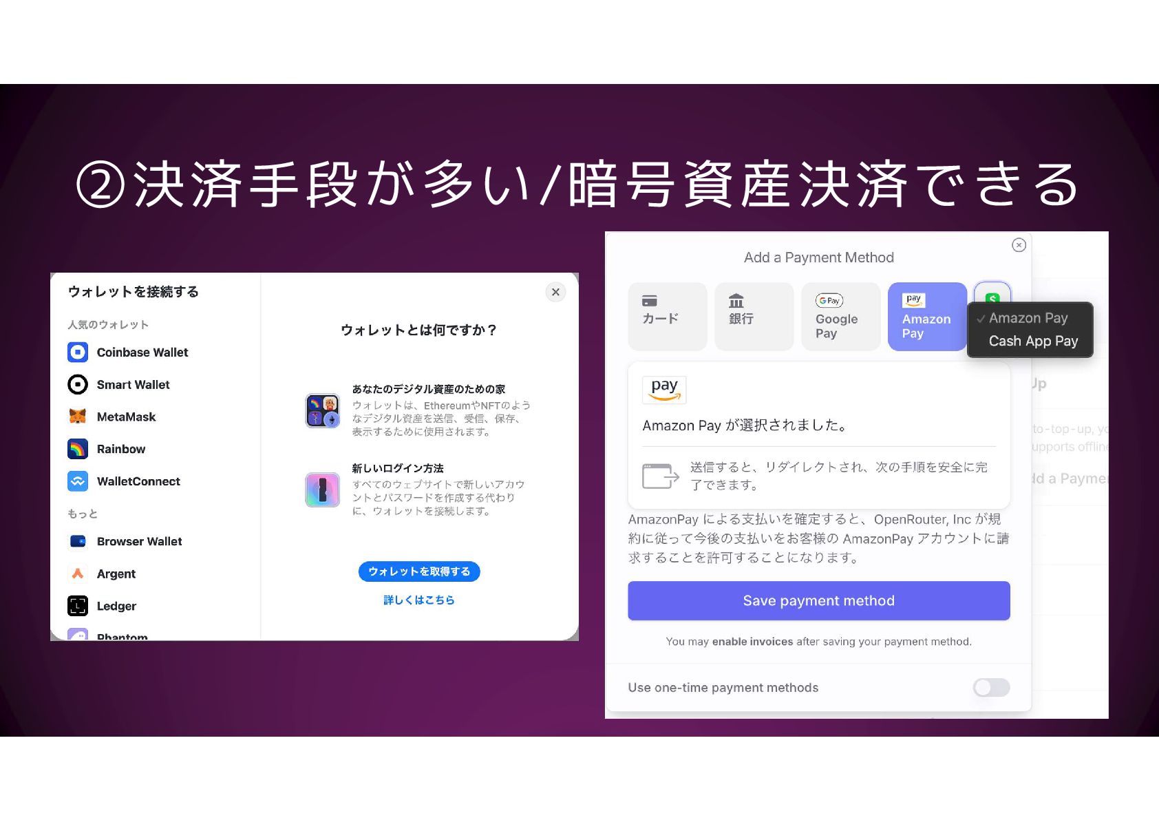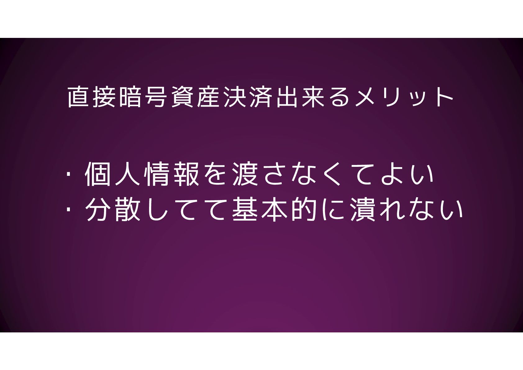 直接暗号資産決済出来るメリット ・個人情報を渡さなくてよい ・分散してて基本的に潰れない