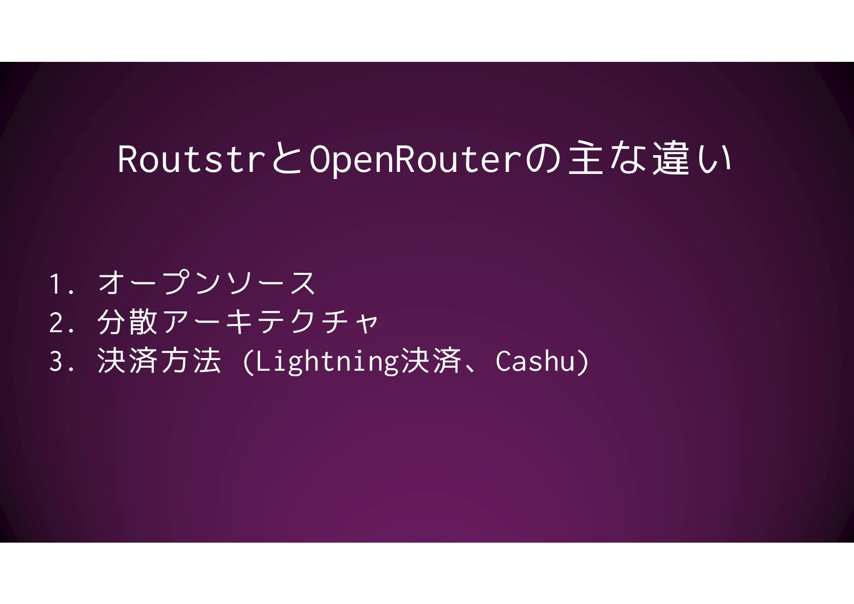 RoutstrとOpenRouterの主な違い 1. オープンソース 2. 分散アーキテクチャ 3. 決済方法 (Lightning決済、Cashu)