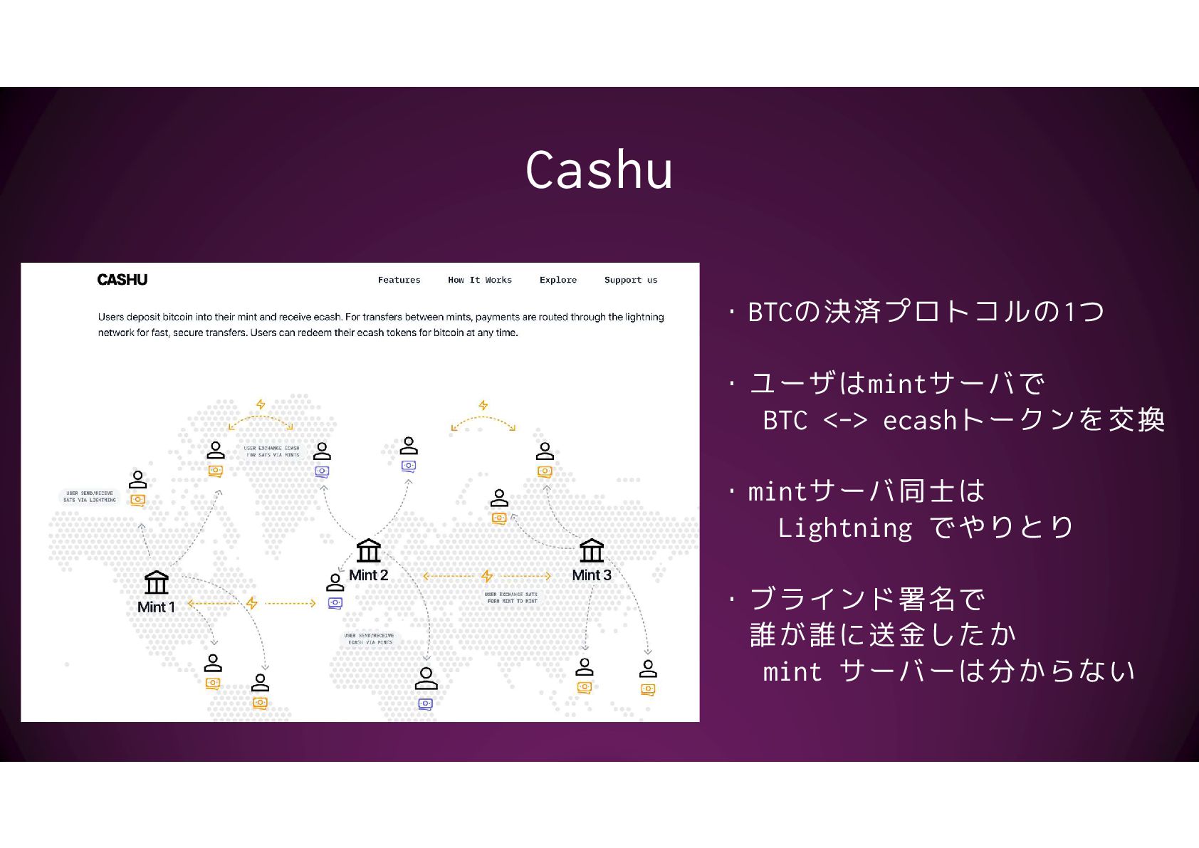 Cashu ・BTCの決済プロトコルの1つ ・ユーザはmintサーバで BTC <-> ecashトークンを交換 ・mintサーバ同士は Lightning でやりとり ・ブラインド署名で