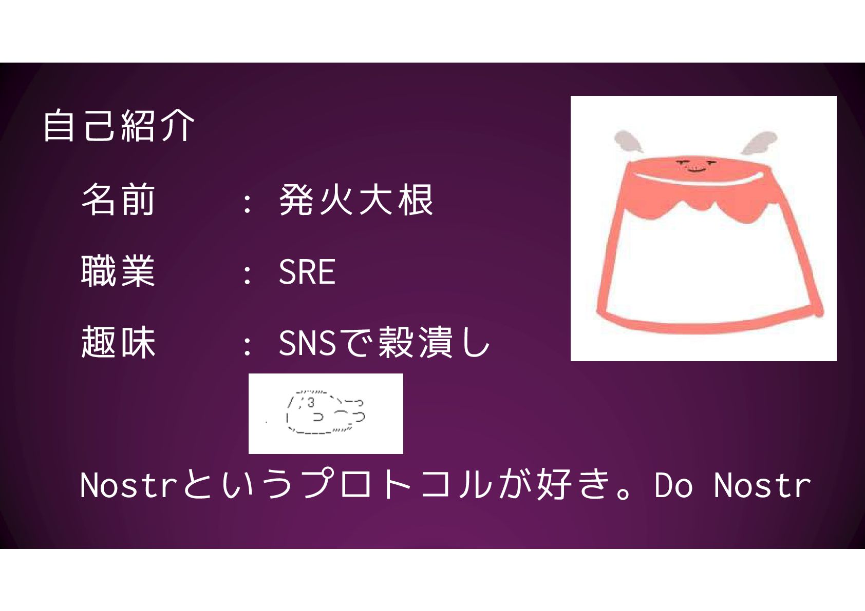 名前 : 発火大根 職業 : SRE 趣味 : SNSで穀潰し Nostrというプロトコルが好き。Do