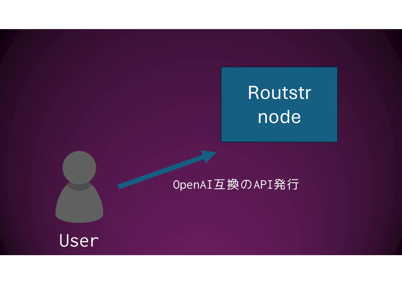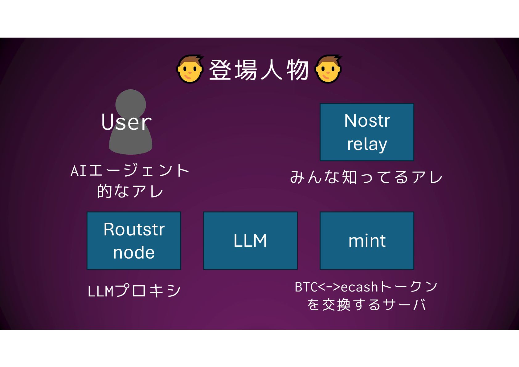 登場人物 Routstr node LLMプロキシ LLM mint BTC<->ecashトークン を交換するサーバ User AIエージェント